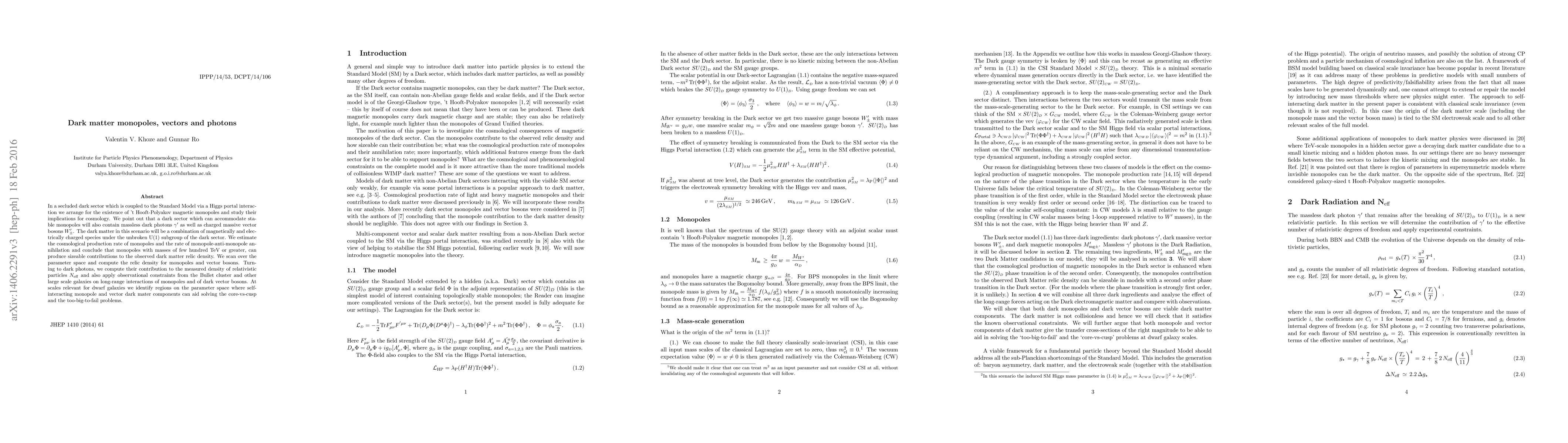 In a secluded dark sector which is coupled to the Standard Model via a Higgs portal interaction we arrange for the existence of 't Hooft-Polyakov magnetic monopoles and study their implications for cosmology. We point out that a dark sector which can accommodate stable monopoles will also contain massless dark photons gamma' as well as charged massive vector bosons W'. The dark matter in this scenario will be a combination of magnetically and electrically charged species under the unbroken U(1) subgroup of the dark sector. We estimate the cosmological production rate of monopoles and the rate of monopole-anti-monopole annihilation and conclude that monopoles with masses of few hundred TeV or greater, can produce sizeable contributions to the observed dark matter relic density. We scan over the parameter space and compute the relic density for monopoles and vector bosons. Turning to the dark photon radiation, we compute their contribution to the measured density of relativistic particles Neff and also apply observational constraints from the Bullet cluster and other large scale galaxies on long-range interactions for the self-interacting dark matter components made out of monopoles and out of dark vector bosons. At scales relevant for dwarf galaxies we identify regions on the parameter space where self-interacting monopole and vector dark mater components can aid solving the core-cusp and the too-big-to-fail problems.