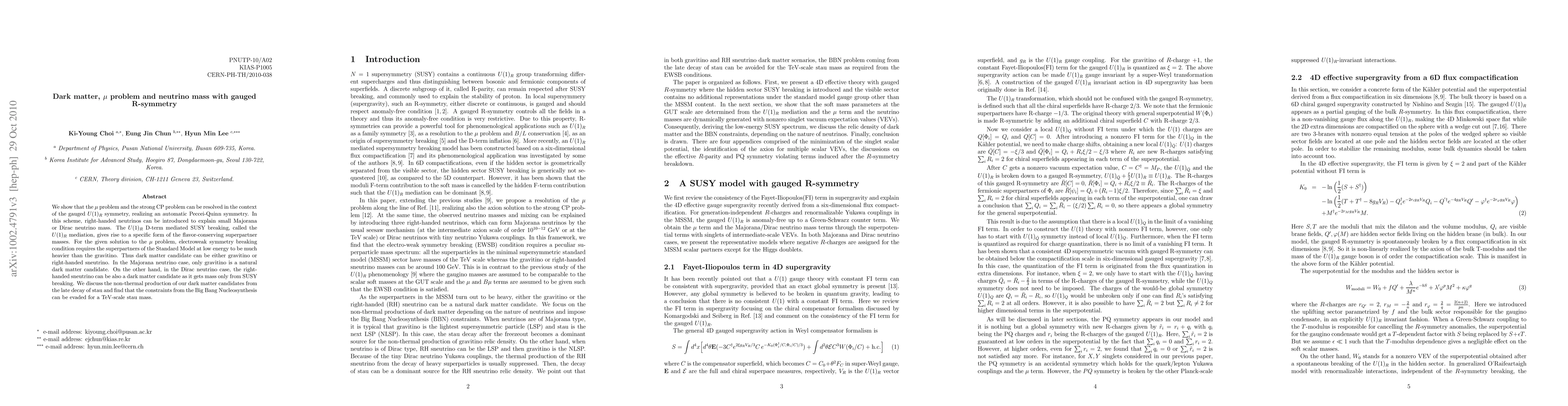 This paper proposes a solution to the mu problem and the strong CP problem using gauged R-symmetry, introducing right-handed neutrinos to explain small neutrino masses. The gravitino or right-handed sneutrino can serve as dark matter candidates, with the latter viable in the Dirac neutrino scenario. Non-thermal production from stau decay allows for TeV-scale stau mass without violating Big Bang Nucleosynthesis constraints.