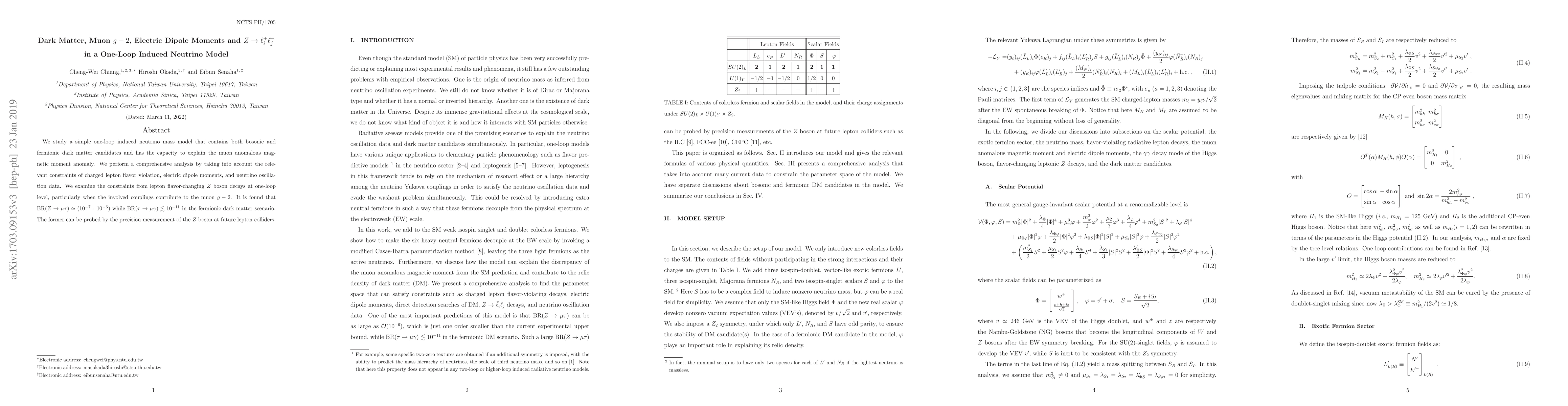 This paper explores a one-loop induced neutrino mass model with both bosonic and fermionic dark matter candidates that addresses the muon anomalous magnetic moment anomaly. It analyzes constraints from lepton flavor violation, electric dipole moments, and neutrino oscillations, finding that the branching ratio for $Z\to \mu\tau$ is in the range of $(10^{-7} - 10^{-6})$, potentially detectable at future lepton colliders.