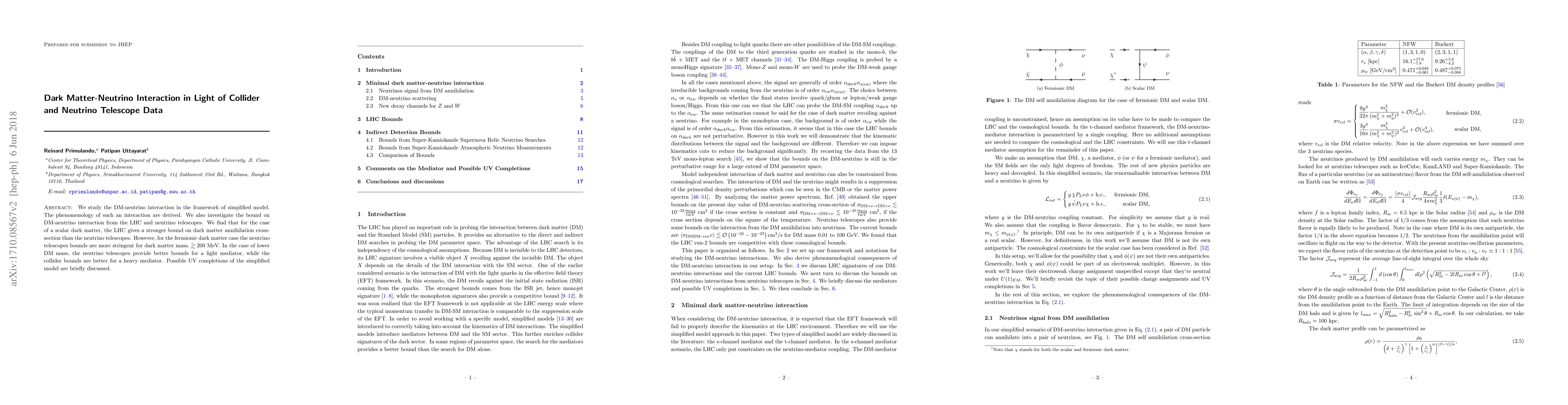 We study the DM-neutrino interaction in the framework of simplified model. The phenomenology of such an interaction are derived. We also investigate the bound on DM-neutrino interaction from the LHC and neutrino telescopes. We find that for the case of a scalar dark matter, the LHC gives a stronger bound on dark matter annihilation cross-section than the neutrino telescopes. However, for the fermionic dark matter case the neutrino telescopes bounds are more stringent for dark matter mass, $\gtrsim 200$ MeV. In the case of lower DM mass, the neutrino telescopes provide better bounds for a light mediator, while the collider bounds are better for a heavy mediator. Possible UV completions of the simplified model are briefly discussed.