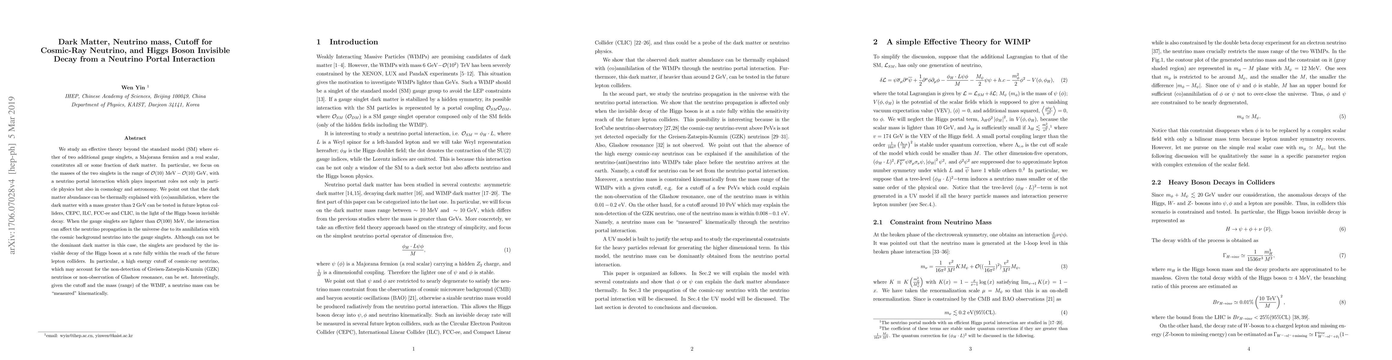 We study an effective theory beyond the standard model (SM) where either of two additional gauge singlets, a Majorana fermion and a real scalar, constitutes all or some fraction of dark matter. In particular, we focus on the masses of the two singlets in the range of O(10) MeV-O(10) GeV, with a neutrino portal interaction which plays important roles not only in particle physics but also in cosmology and astronomy. We point out that the dark matter abundance can be thermally explained with (co)annihilation, where the dark matter with a mass greater than 2 GeV can be tested in future lepton colliders, CEPC, ILC, FCC-ee and CLIC, in the light of the Higgs boson invisible decay. When the gauge singlets are lighter than O(100)MeV, the interaction can affect the neutrino propagation in the universe due to its annihilation with the cosmic background neutrino into the gauge singlets. Although can not be the dominant dark matter in this case, the singlets are produced by the invisible decay of the Higgs boson at a rate fully within the reach of the future lepton colliders. In particular, a high energy cutoff of cosmic-ray neutrino, which may account for the non-detection of Greisen-Zatsepin-Kuzmin (GZK) neutrinos or non-observation of Glashow resonance, can be set. Interestingly, given the cutoff and the mass (range) of the WIMP, a neutrino mass can be "measured" kinematically.