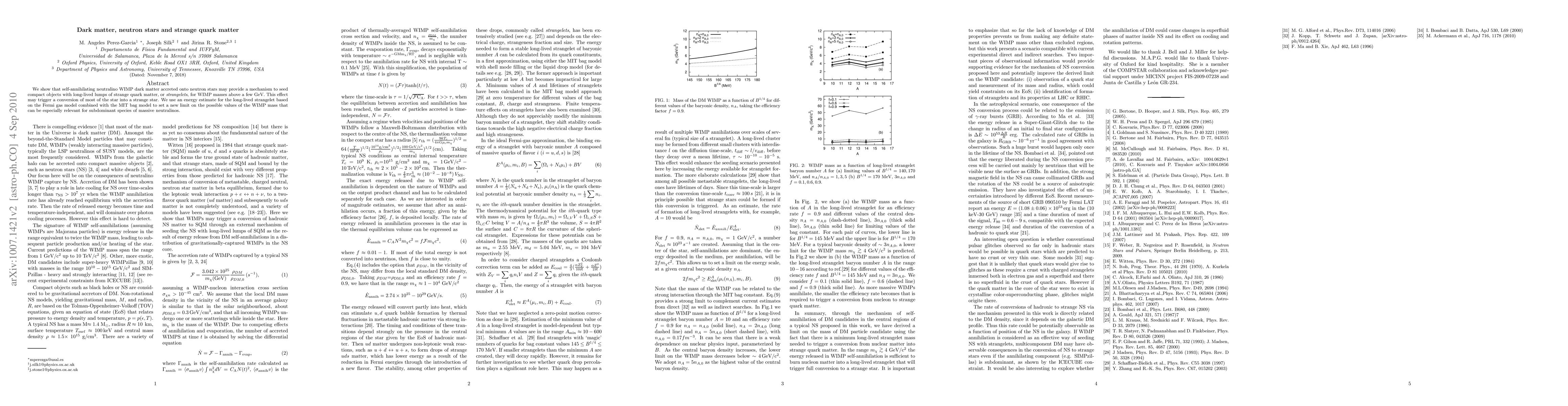 This paper explores how self-annihilating neutralino dark matter accreting onto neutron stars could lead to the formation of strange quark matter, or strangelets, potentially converting most of the star into a strange star. The study sets a new limit on the WIMP mass using an energy estimate from the Fermi gas and MIT bag models.