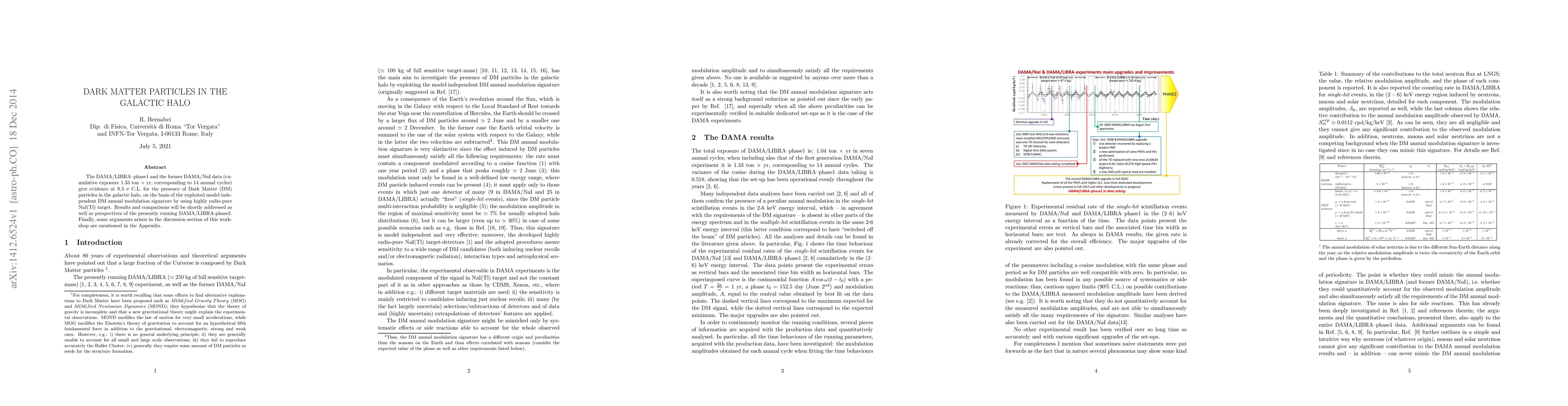The DAMA/LIBRA-phase1 and the former DAMA/NaI data (cumulative exposure 1.33 ton $\times$ yr, corresponding to 14 annual cycles) give evidence at 9.3 $\sigma$ C.L. for the presence of Dark Matter (DM) particles in the galactic halo, on the basis of the exploited model independent DM annual modulation signature by using highly radio-pure NaI(Tl) target. Results and comparisons will be shortly addressed as well as perspectives of the presently running DAMA/LIBRA-phase2. Finally, some arguments arisen in the discussion section of this workshop are mentioned in the Appendix.