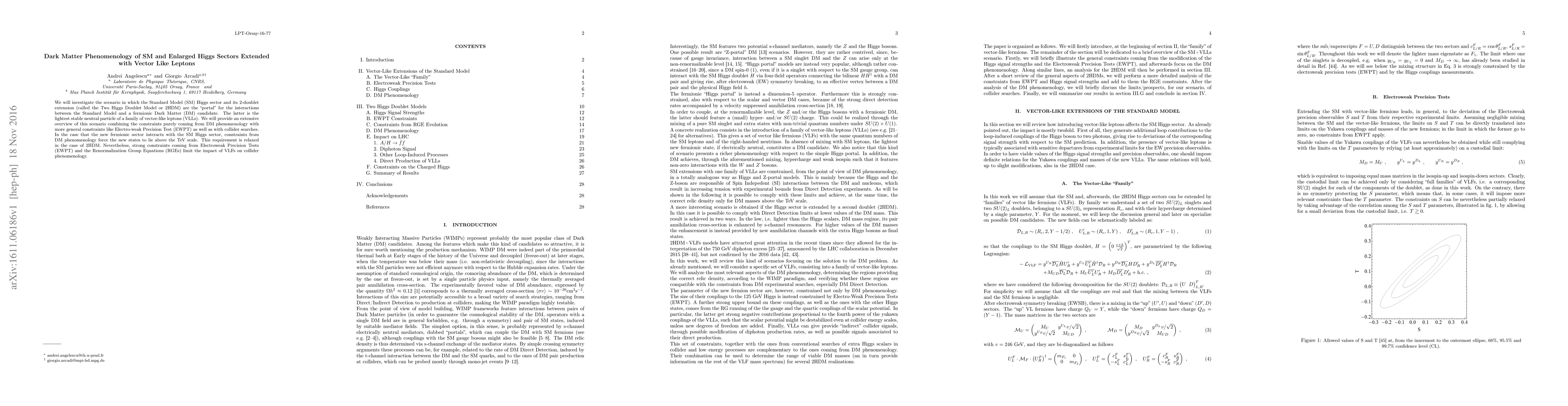 We will investigate the scenario in which the Standard Model (SM) Higgs sector and its 2-doublet extension (called the Two Higgs Doublet Model or 2HDM) are the "portal" for the interactions between the Standard Model and a fermionic Dark Matter (DM) candidate. The latter is the lightest stable neutral particle of a family of vector-like leptons (VLLs). We will provide an extensive overview of this scenario combining the constraints purely coming from DM phenomenology with more general constraints like Electro-weak Precision Tests (EWPT) as well as with collider searches. In the case that the new fermionic sector interacts with the SM Higgs sector, constraints from DM phenomenology force the new states to lie above the TeV scale. This requirement is relaxed in the case of 2HDM. Nevertheless, strong constraints coming from Electroweak Precision Tests (EWPT) and the Renormalization Group Equations (RGEs) limit the impact of VLFs on collider phenomenology.