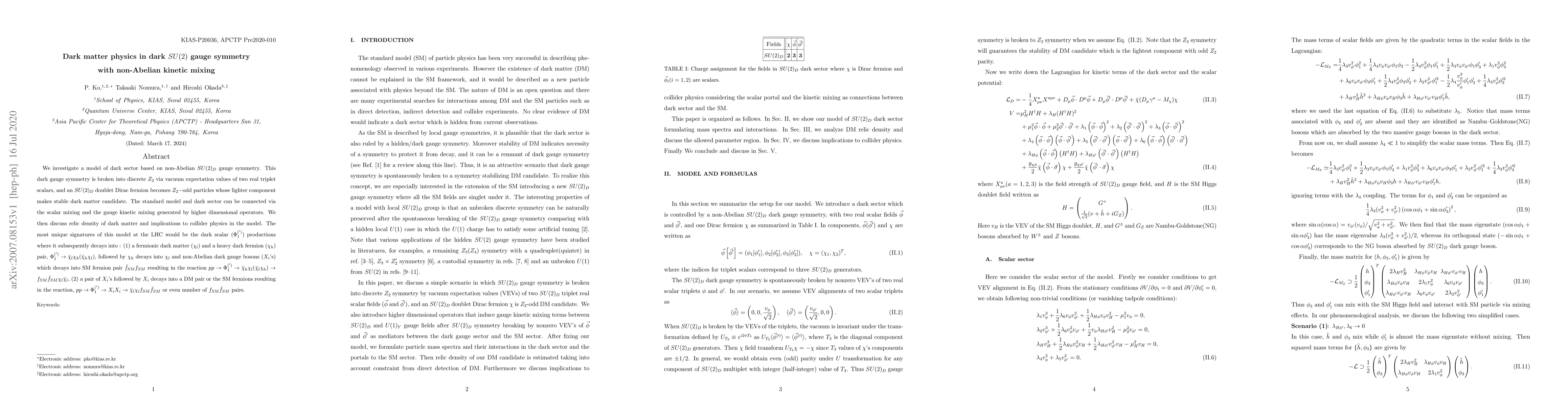This paper explores a dark sector model with non-Abelian $SU(2)_D$ gauge symmetry, where a Dirac fermion becomes a stable dark matter candidate. It discusses the model's connection to the Standard Model via scalar and kinetic mixing, and predicts unique LHC signatures involving dark scalar productions and decays into dark matter and gauge bosons.