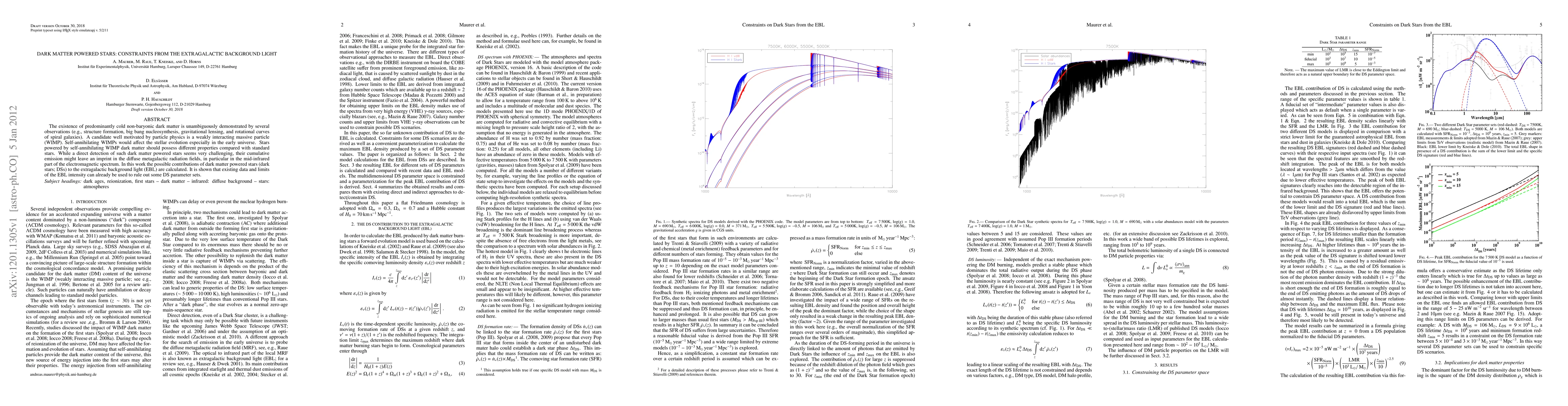 The existence of predominantly cold non-baryonic dark matter is unambiguously demonstrated by several observations (e.g., structure formation, big bang nucleosynthesis, gravitational lensing, and rotational curves of spiral galaxies). A candidate well motivated by particle physics is a weakly interacting massive particle (WIMP). Self-annihilating WIMPs would affect the stellar evolution especially in the early universe. Stars powered by self-annihilating WIMP dark matter should possess different properties compared with standard stars. While a direct detection of such dark matter powered stars seems very challenging, their cumulative emission might leave an imprint in the diffuse metagalactic radiation fields, in particular in the mid-infrared part of the electromagnetic spectrum. In this work the possible contributions of dark matter powered stars (dark stars; DSs) to the extragalactic background light (EBL) are calculated. It is shown that existing data and limits of the EBL intensity can already be used to rule out some DS parameter sets.