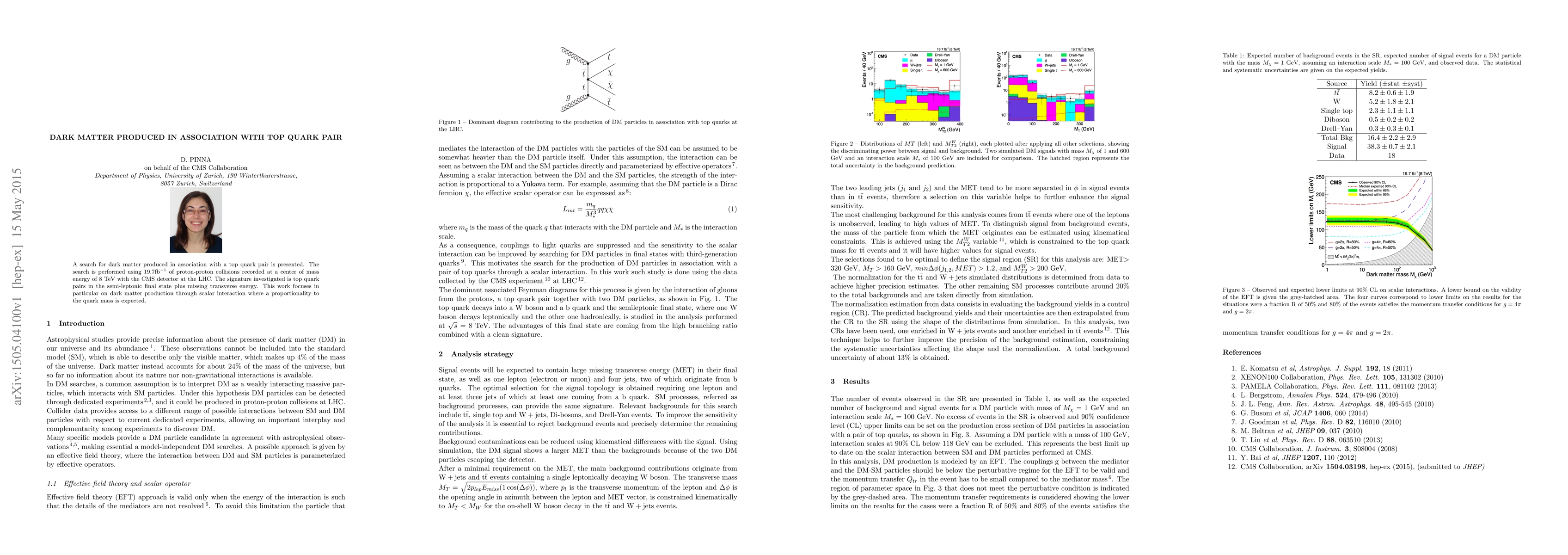 This paper investigates dark matter production in association with top quark pairs using data from the CMS detector at the LHC, analyzing proton-proton collisions at 8 TeV. The study focuses on scalar interactions and looks for signatures in semi-leptonic final states with missing transverse energy.
