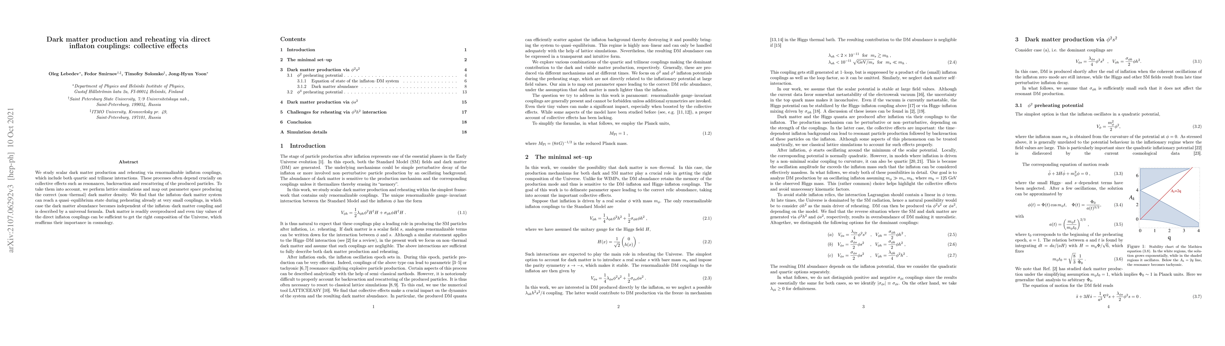 This paper investigates scalar dark matter production and reheating through renormalizable inflaton couplings, emphasizing collective effects like resonances and backreaction. Using lattice simulations, it finds that even small couplings can lead to a quasi-equilibrium state during preheating, resulting in a universal formula for dark matter abundance.