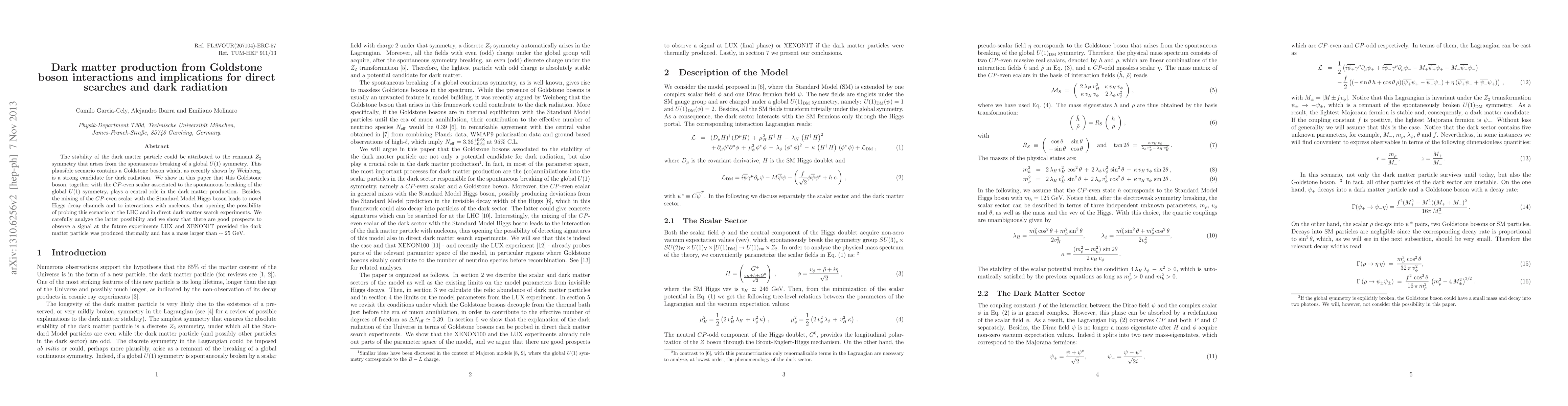 This paper explores the production of dark matter via interactions of Goldstone bosons resulting from a spontaneously broken U(1) symmetry, proposing a scenario where these particles could also contribute to dark radiation. It also discusses the potential for detecting this dark matter through novel decay channels of the CP-even scalar and interactions with nucleons, suggesting promising prospects for observing signals in future experiments like LUX and XENON1T.