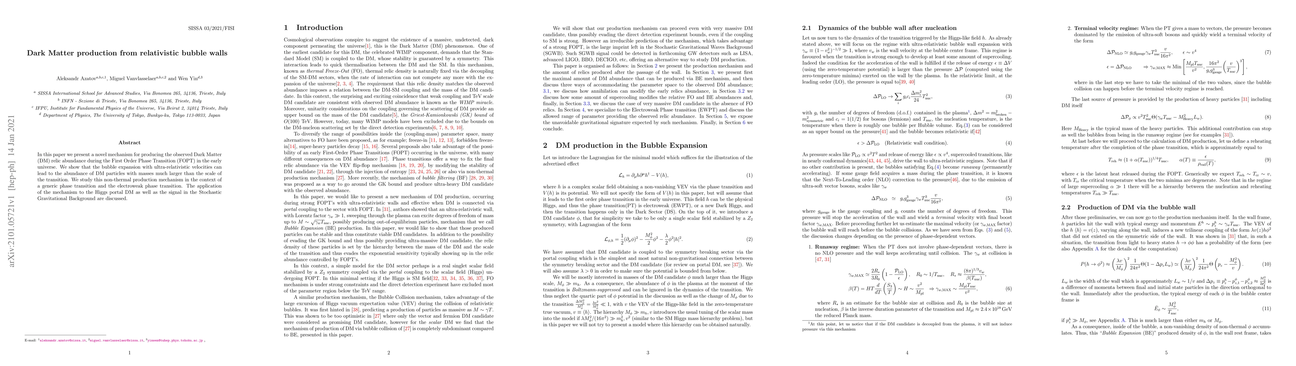 This paper proposes a novel mechanism for Dark Matter production during the First Order Phase Transition in the early universe, where ultra-relativistic bubble expansion generates DM particles with large masses. It explores this non-thermal production in the context of generic and electroweak phase transitions, with applications to Higgs portal DM and implications for Stochastic Gravitational Background signals.