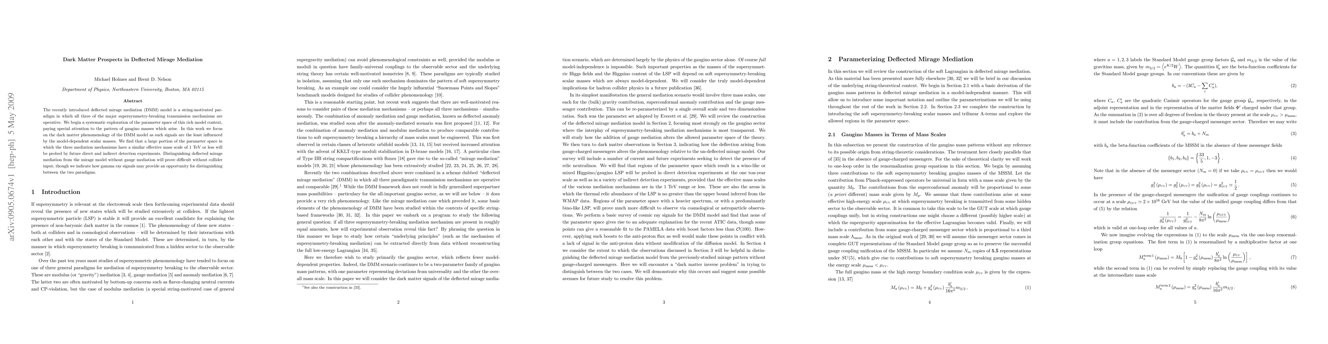 This paper explores dark matter prospects in the deflected mirage mediation (DMM) model, focusing on gaugino masses and direct/indirect detection prospects. Future experiments may probe large regions of parameter space where three supersymmetry-breaking mechanisms operate, with gamma rays potentially distinguishing DMM from other mirage models.