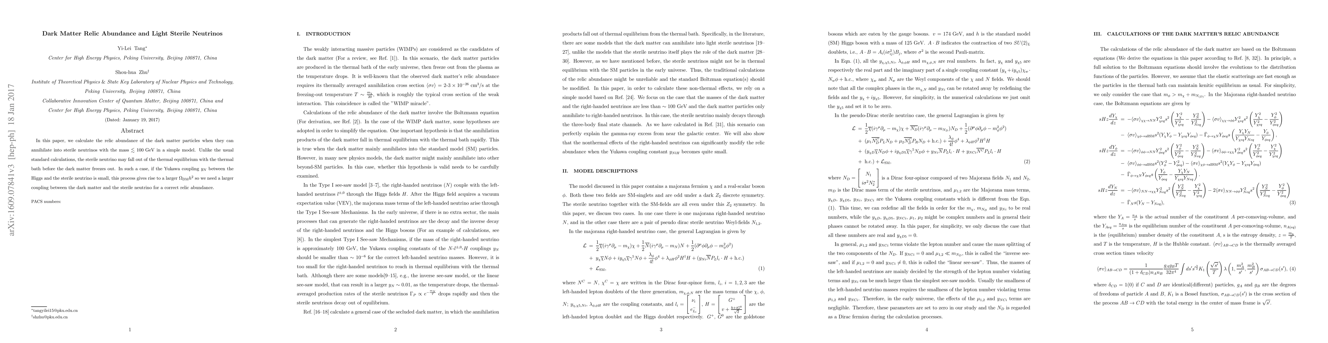 This paper explores the relic abundance of dark matter particles that can annihilate into light sterile neutrinos with masses up to 100 GeV. It finds that if sterile neutrinos decouple from thermal equilibrium before dark matter freezes out, a smaller Yukawa coupling between the Higgs and sterile neutrinos can lead to a larger dark matter density, requiring a stronger dark matter-sterile neutrino interaction for accurate relic abundance.