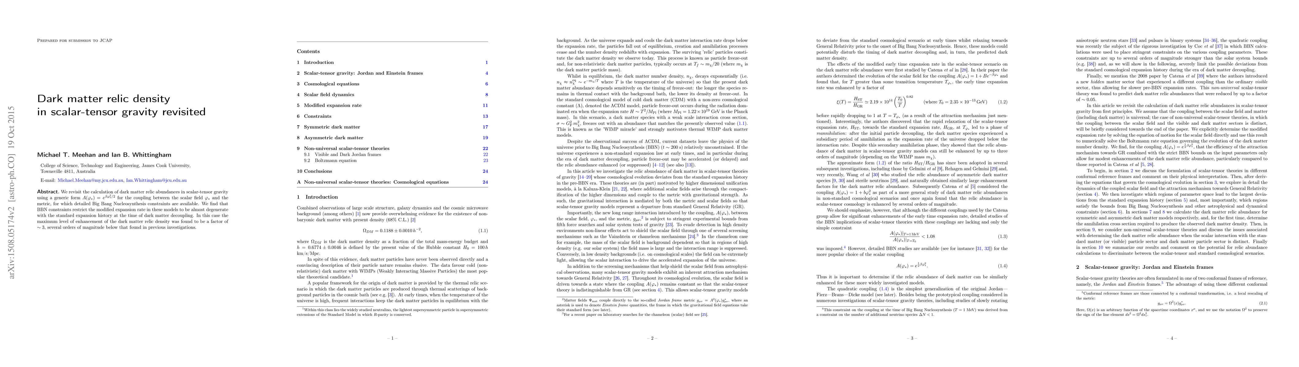 Dark matter relic density in scalar-tensor gravity is revisited with new constraints from Big Bang Nucleosynthesis, showing a factor of ~3 enhancement below previous findings.