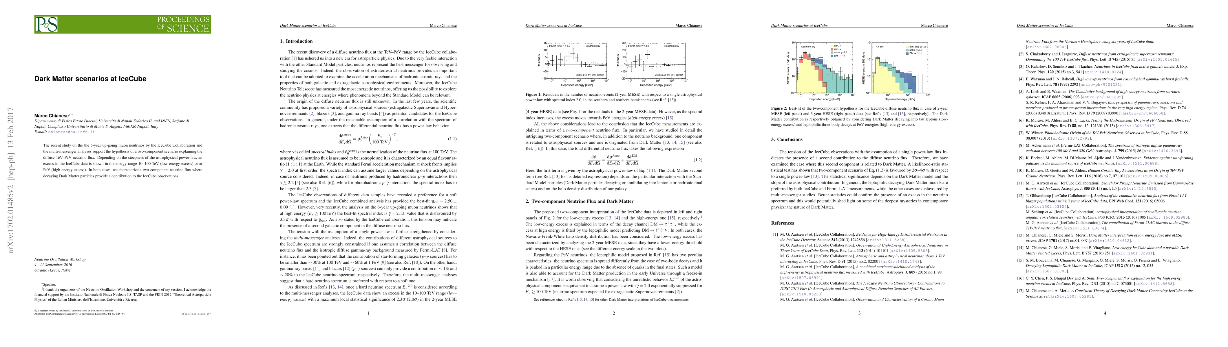 The study supports a two-component scenario for the diffuse TeV-PeV neutrino flux, with decaying Dark Matter particles contributing to the high-energy excess in IceCube data.