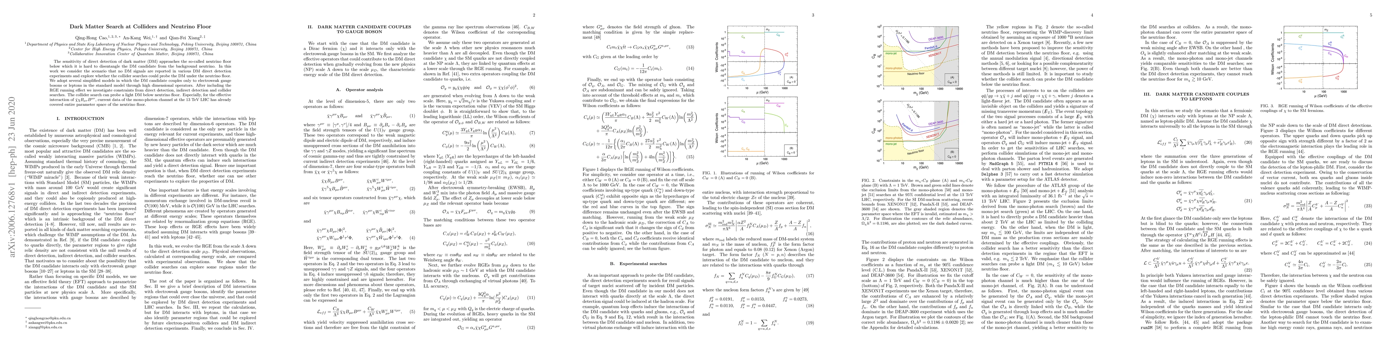 The sensitivity of direct detection of dark matter (DM) approaches the so-called neutrino floor below which it is hard to disentangle the DM candidate from the background neutrino. In this work we consider the scenario that no DM signals are reported in various DM direct detection experiments and explore whether the collider searches could probe the DM under the neutrino floor. We adopt several simplified models in which the DM candidate couples only to electroweak gauge bosons or leptons in the standard model through high dimensional operators. After including the RGE running effect we investigate constraints from direct detection, indirect detection and collider searches. The collider search can probe a light DM below neutrino floor. Especially, for the effective interaction of $\bar{\chi}\chi B_{\mu\nu}B^{\mu\nu}$, current data of the mono-photon channel at the 13 TeV LHC has already covered entire parameter space of the neutrino floor.