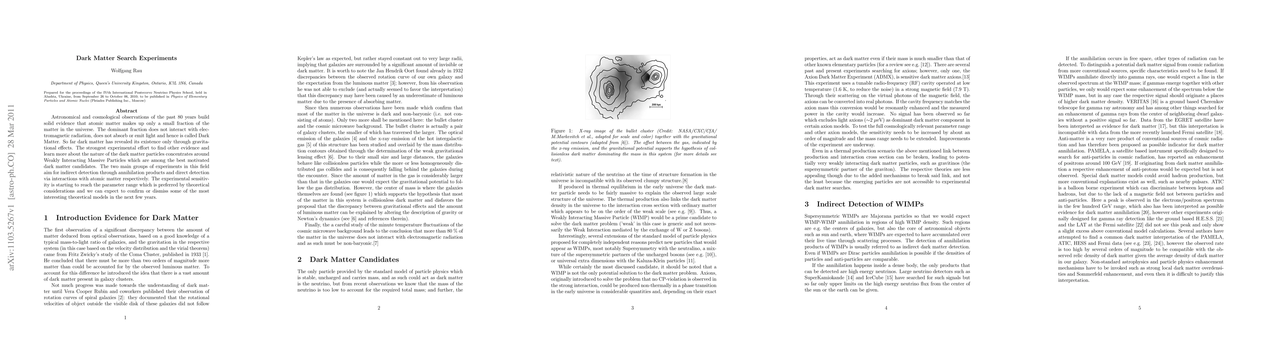 Astronomical and cosmological observations of the past 80 years build solid evidence that atomic matter makes up only a small fraction of the matter in the universe. The dominant fraction does not interact with electromagnetic radiation, does not absorb or emit light and hence is called Dark Matter. So far dark matter has revealed its existence only through gravitational effects. The strongest experimental effort to find other evidence and learn more about the nature of the dark matter particles concentrates around Weakly Interacting Massive Particles which are among the best motivated dark matter candidates. The two main groups of experiments in this field aim for indirect detection through annihilation products and direct detection via interactions with atomic matter respectively. The experimental sensitivity is starting to reach the parameter range which is preferred by theoretical considerations and we can expect to confirm or dismiss some of the most interesting theoretical models in the next few years.