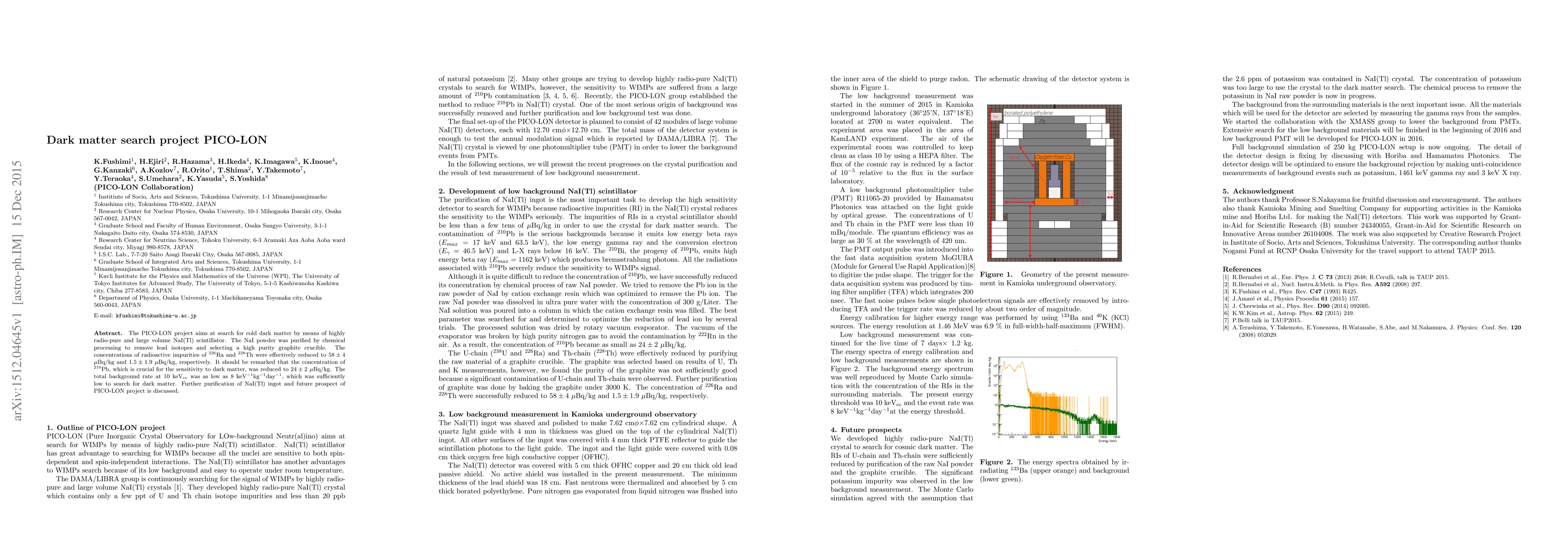 The PICO-LON project employs highly purified NaI(Tl) scintillators to search for cold dark matter, achieving significant reductions in radioactive impurities, particularly $^{210}$Pb, to enhance sensitivity. The project's low background rate of 8 keV$^{-1}$kg$^{-1}$day$^{-1}$ at 10 keVee supports effective dark matter detection.