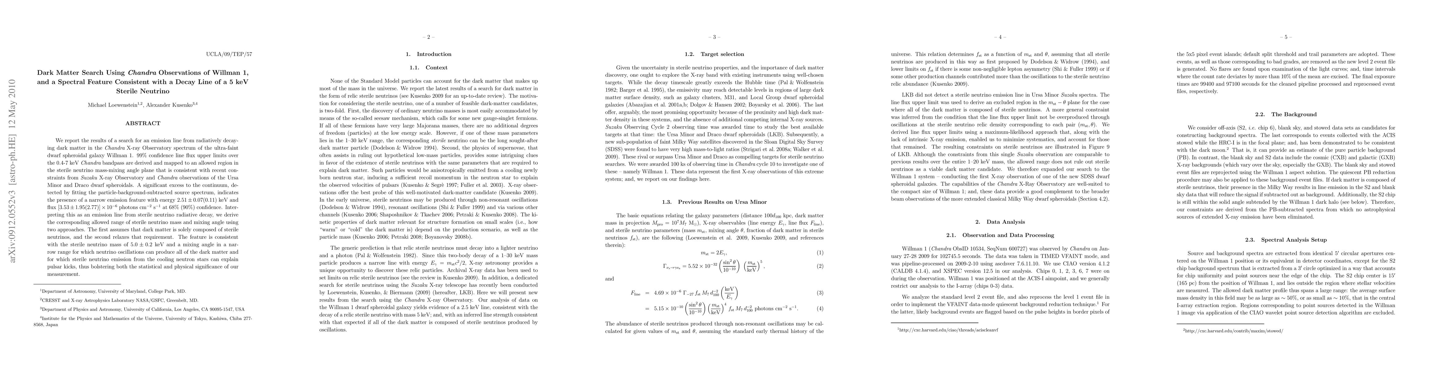 This paper reports a search for dark matter in Willman 1 using Chandra X-ray Observatory data, finding a significant spectral feature consistent with a 5 keV sterile neutrino decay line. The feature suggests a sterile neutrino mass of 5.0 +/- 0.2 keV and supports models where sterile neutrinos account for dark matter and explain pulsar kicks.
