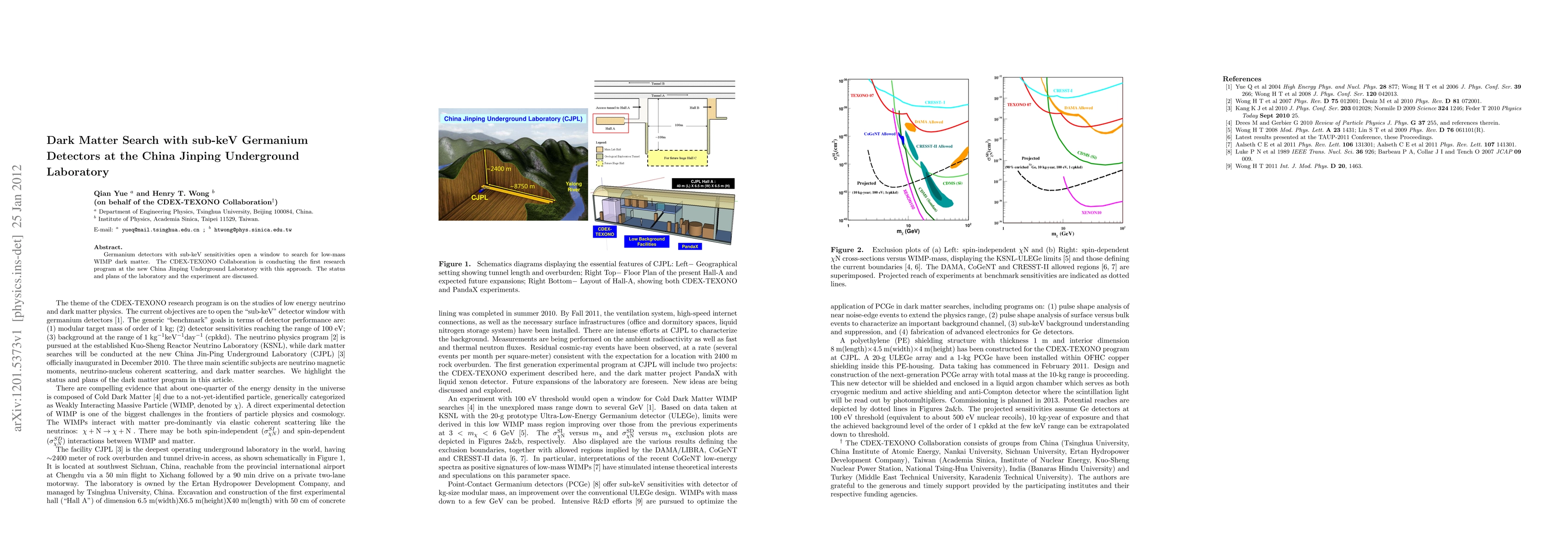 This paper discusses the use of sub-keV Germanium detectors to search for low-mass WIMP dark matter, led by the CDEX-TEXONO Collaboration at the China Jinping Underground Laboratory. It outlines the current status and future plans of the experiment and the laboratory.