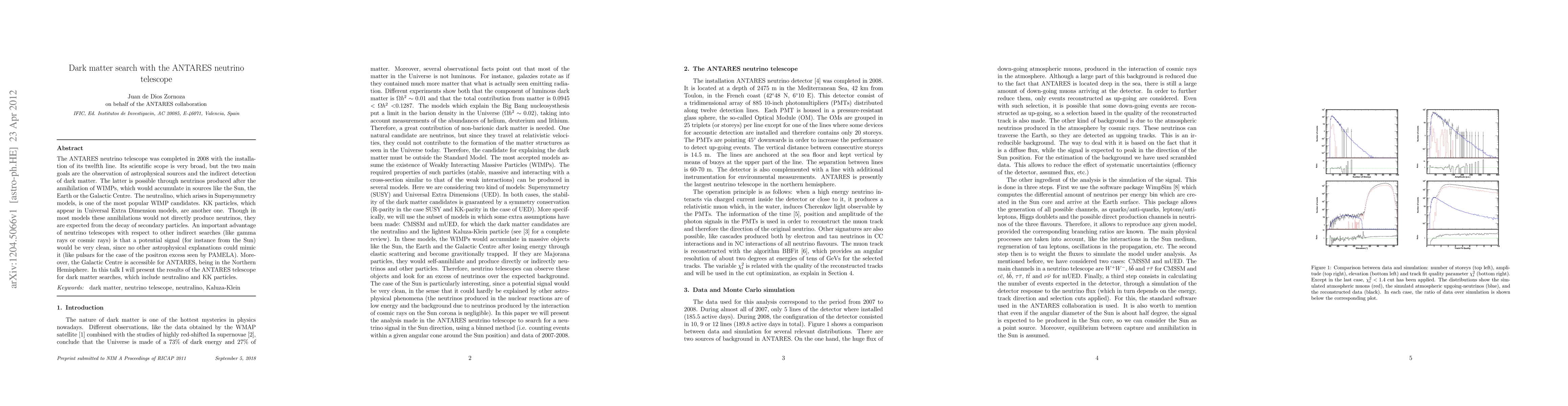 The ANTARES neutrino telescope, completed in 2008, was used to search for dark matter by observing astrophysical sources and indirect detection of dark matter through neutrinos produced after the annihilation of WIMPs, such as neutralinos from Supersymmetry models or KK particles from Universal Extra Dimension models. The study focused on potential dark matter signals from sources like the Sun, Earth, or Galactic Centre, with neutrinos being a clean signal compared to other indirect searches like gamma rays or cosmic rays.
