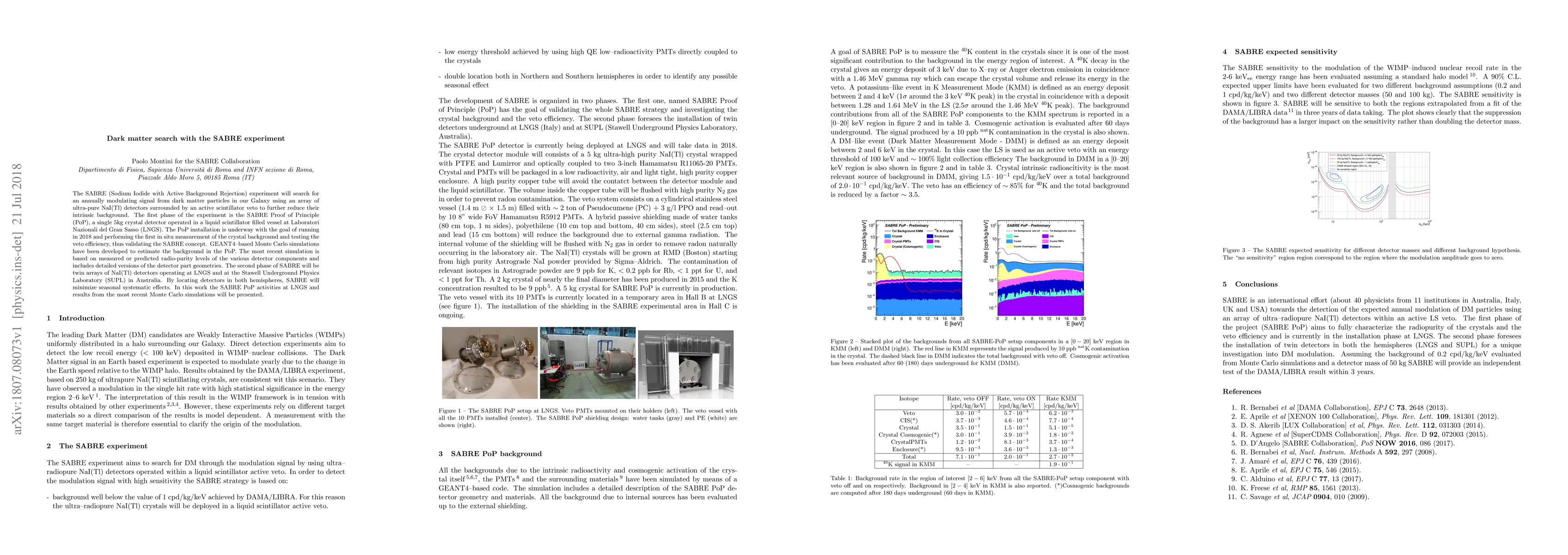 The SABRE (Sodium Iodide with Active Background Rejection) experiment will search for an annually modulating signal from dark matter particles in our Galaxy using an array of ultra-pure NaI(Tl) detectors surrounded by an active scintillator veto to further reduce their intrinsic background. The first phase of the experiment is the SABRE Proof of Principle (PoP), a single 5kg crystal detector operated in a liquid scintillator filled vessel at Laboratori Nazionali del Gran Sasso (LNGS). The PoP installation is underway with the goal of running in 2018 and performing the first in situ measurement of the crystal background and testing the veto efficiency, thus validating the SABRE concept. GEANT4--based Monte Carlo simulations have been developed to estimate the background in the PoP. The most recent simulation is based on measured or predicted radio-purity levels of the various detector components and includes detailed versions of the detector part geometries. The second phase of SABRE will be twin arrays of NaI(Tl) detectors operating at LNGS and at the Stawell Underground Physics Laboratory (SUPL) in Australia. By locating detectors in both hemispheres, SABRE will minimize seasonal systematic effects. In this work the SABRE PoP activities at LNGS and results from the most recent Monte Carlo simulations will be presented.