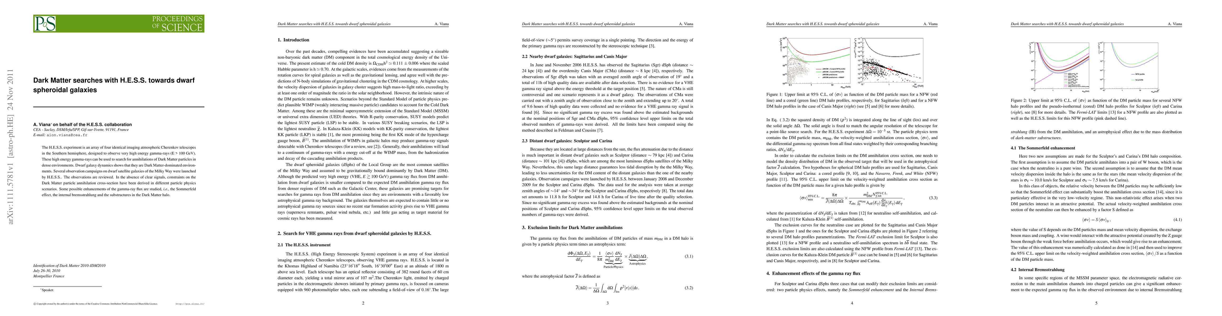 The H.E.S.S. experiment searches for Dark Matter annihilation signals in dwarf spheroidal galaxies using high energy gamma-rays. Despite no clear signals, constraints on the Dark Matter annihilation cross-section were derived, with studies on potential flux enhancements like the Sommerfeld effect.