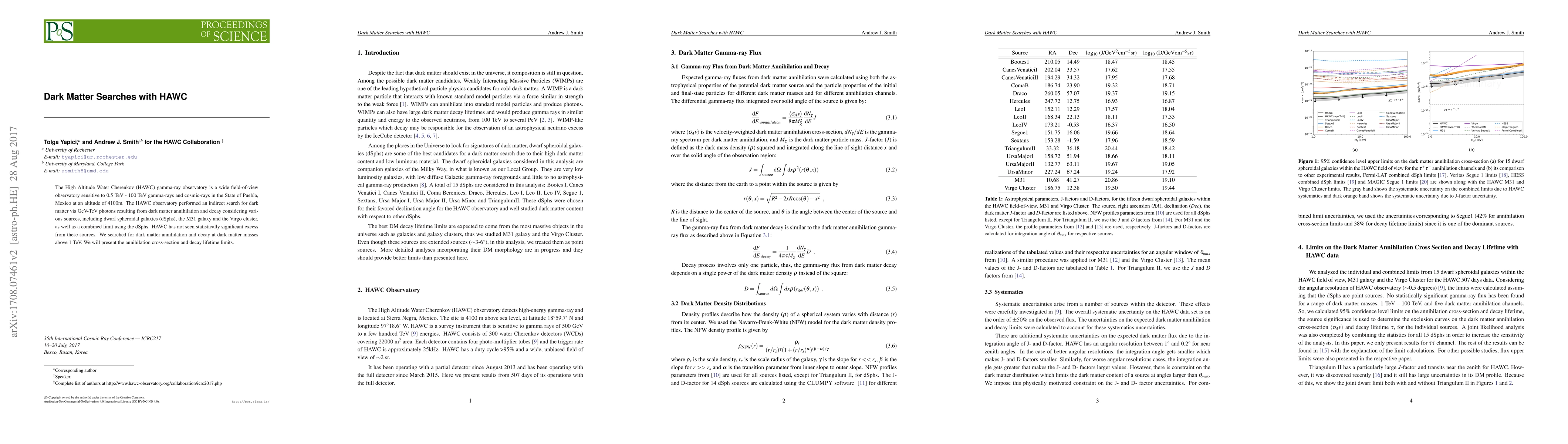 The HAWC observatory conducted an indirect search for dark matter via GeV-TeV photons from potential annihilation and decay sources, but found no statistically significant excess. Limits on the annihilation cross-section and decay lifetime for dark matter masses above 1 TeV were derived.