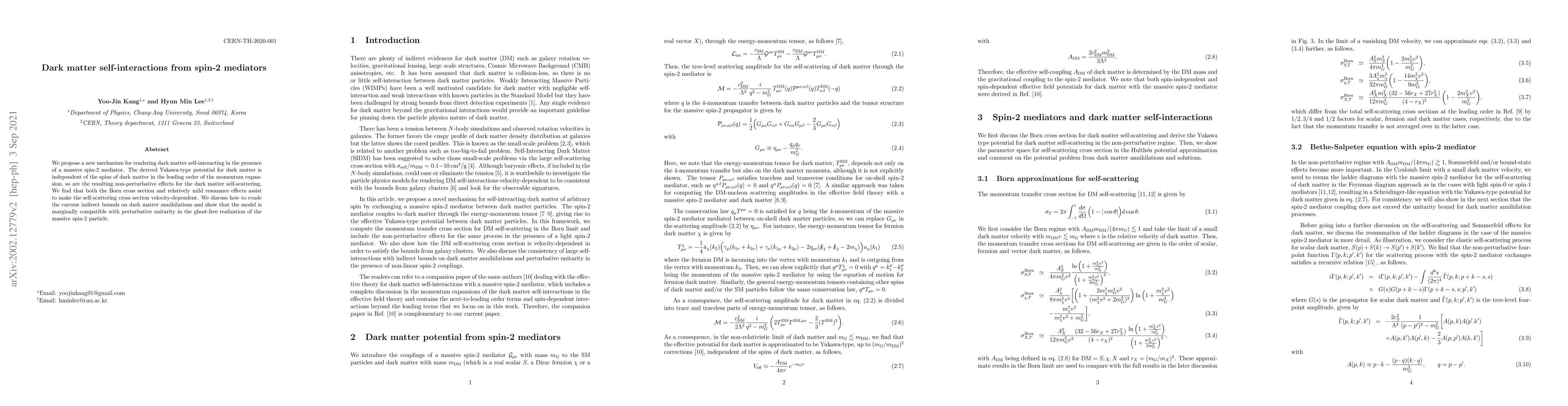 This paper proposes a mechanism for dark matter self-interactions via a spin-2 mediator, resulting in a Yukawa-type potential that leads to velocity-dependent self-scattering. The model is compatible with current indirect bounds and perturbative unitarity in its ghost-free realization.