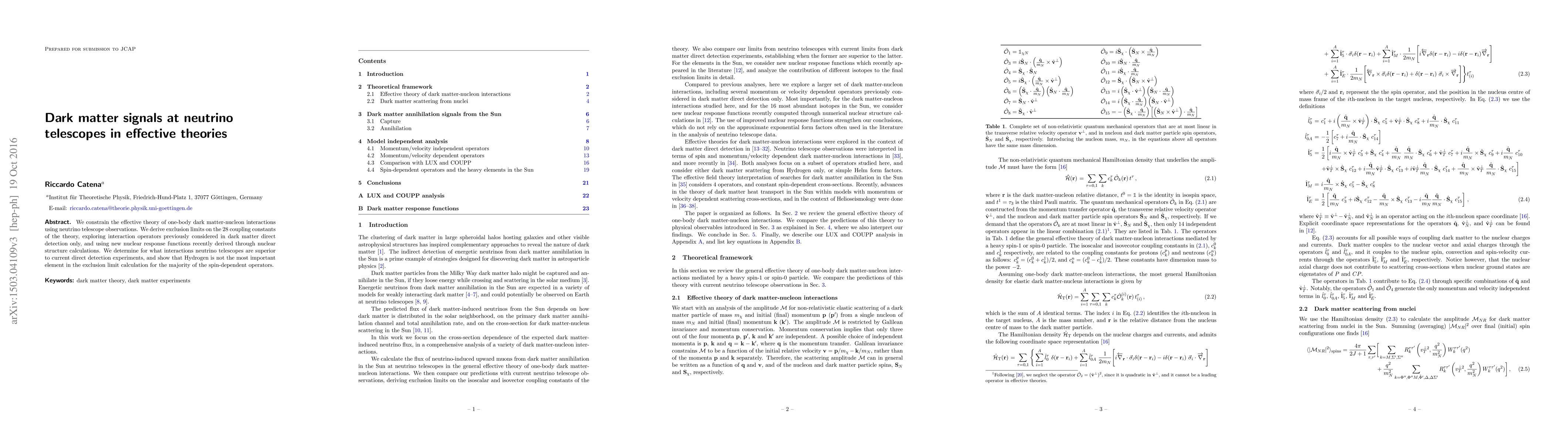 We constrain the effective theory of one-body dark matter-nucleon interactions using neutrino telescope observations. We derive exclusion limits on the 28 coupling constants of the theory, exploring interaction operators previously considered in dark matter direct detection only, and using new nuclear response functions recently derived through nuclear structure calculations. We determine for what interactions neutrino telescopes are superior to current direct detection experiments, and show that Hydrogen is not the most important element in the exclusion limit calculation for the majority of the spin-dependent operators.