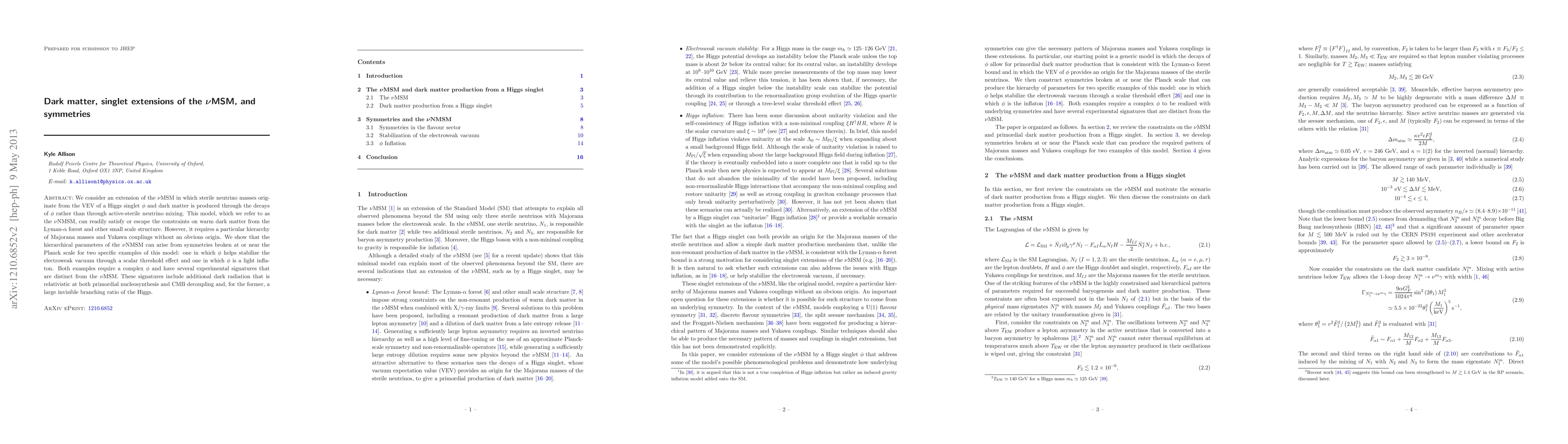 This paper proposes an extension of the nuMSM model, termed the nuNMSM, where dark matter is produced via Higgs singlet decays instead of active-sterile neutrino mixing, potentially evading warm dark matter constraints. It explores symmetries broken at the Planck scale to justify the model's mass hierarchy and identifies unique experimental signatures, including additional relativistic dark radiation and a significant invisible Higgs branching ratio.