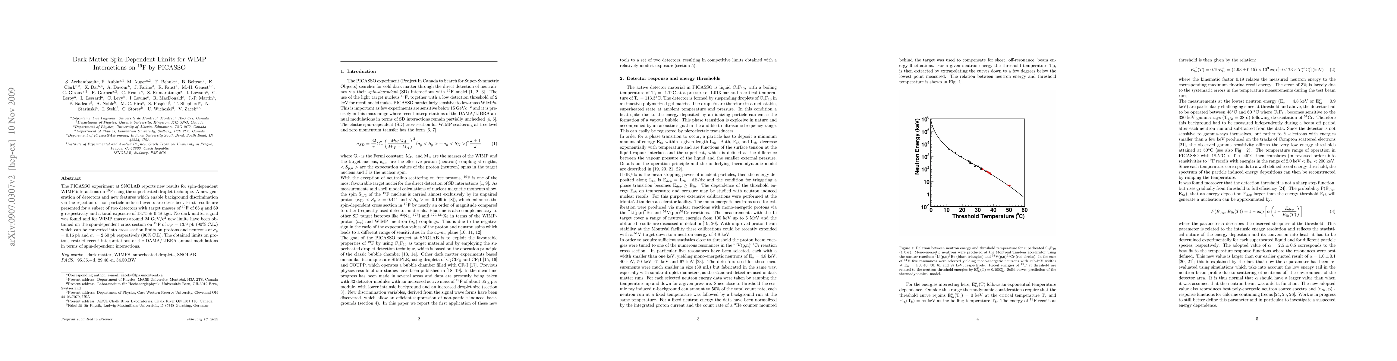 The PICASSO experiment at SNOLAB reports new results for spin-dependent WIMP interactions on $^{19}$F using the superheated droplet technique. A new generation of detectors and new features which enable background discrimination via the rejection of non-particle induced events are described. First results are presented for a subset of two detectors with target masses of $^{19}$F of 65 g and 69 g respectively and a total exposure of 13.75 $\pm$ 0.48 kgd. No dark matter signal was found and for WIMP masses around 24 GeV/c$^2$ new limits have been obtained on the spin-dependent cross section on $^{19}$F of $\sigma_F$ = 13.9 pb (90% C.L.) which can be converted into cross section limits on protons and neutrons of $\sigma_p$ = 0.16 pb and $\sigma_n$ = 2.60 pb respectively (90% C.L). The obtained limits on protons restrict recent interpretations of the DAMA/LIBRA annual modulations in terms of spin-dependent interactions.