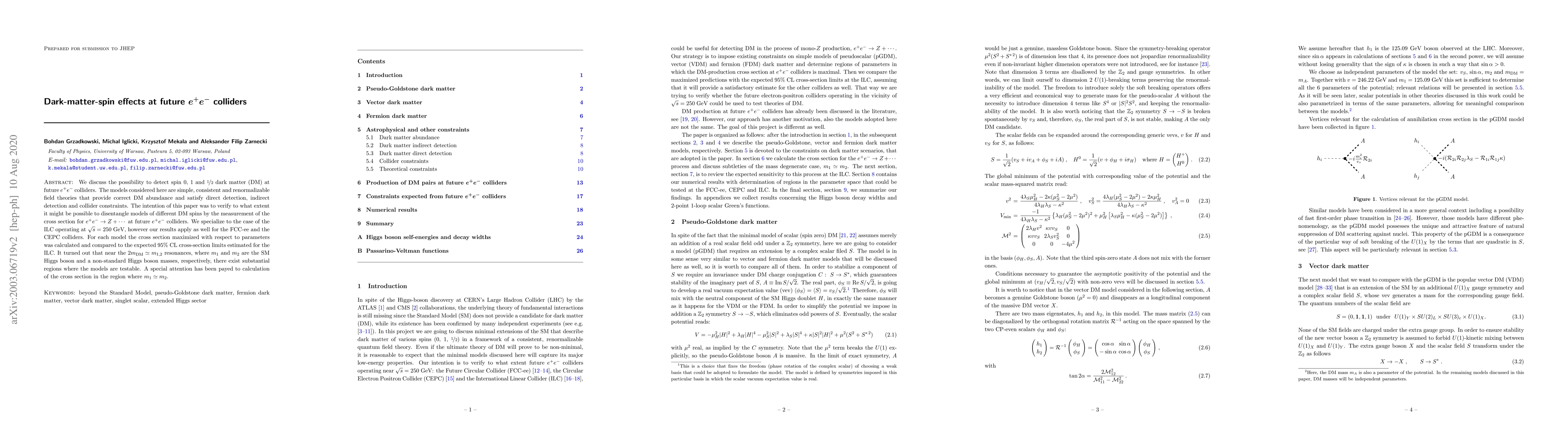 We discuss possibility to detect spin 0, 1 and 1/2 dark matter (DM) at future $e^{+} e^{-}$ colliders. The models considered here are simple, consistent and renormalizable field theories, that provide correct DM abundance and satisfy direct detection, indirect detection and collider constraints. The intention of this paper was to verify to what extend it might be possible to disentangle models of different DM spins by measurement of the cross section for $e^{+} e^{-} \to Z + \ldots\,$ at future $e^{+} e^{-}$ colliders. We specialize to the case of the ILC operating at $\sqrt{s} = 250~\text{GeV}$, however our results apply as well for the FCC-ee and the CEPC colliders. For each model the cross section maximized with respect to parameters was calculated and compared to the expected 95% CL cross-section limits estimated for the ILC. It turned out that near $2 m_{\text{DM}}\simeq m_{1,2}$ resonances, where $m_{1}$ and $m_{2}$ are the SM Higgs boson and a non-standard Higgs boson masses, respectively, there exist substantial regions where the models are testable. A special attention has been payed to calculation of the cross section in the region where $m_{1}\simeq m_{2}$.