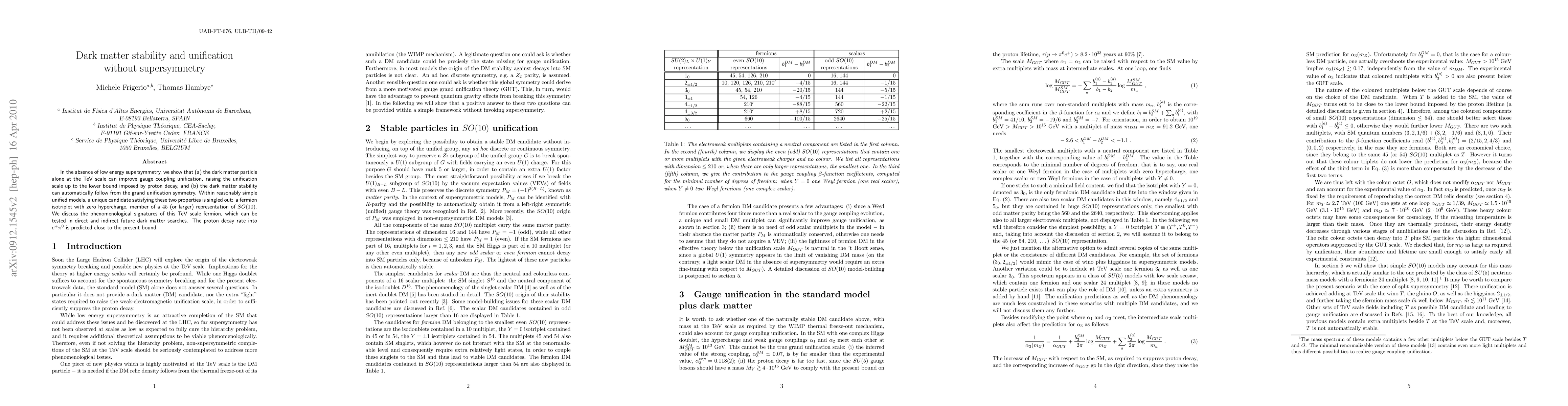 In the absence of low energy supersymmetry, we show that (a) the dark matter particle alone at the TeV scale can improve gauge coupling unification, raising the unification scale up to the lower bound imposed by proton decay, and (b) the dark matter stability can automatically follow from the grand unification symmetry. Within reasonably simple unified models, a unique candidate satisfying these two properties is singled out: a fermion isotriplet with zero hypercharge, member of a 45 (or larger) representation of SO(10). We discuss the phenomenological signatures of this TeV scale fermion, which can be tested in direct and indirect future dark matter searches. The proton decay rate into e^+ \pi^0 is predicted close to the present bound.