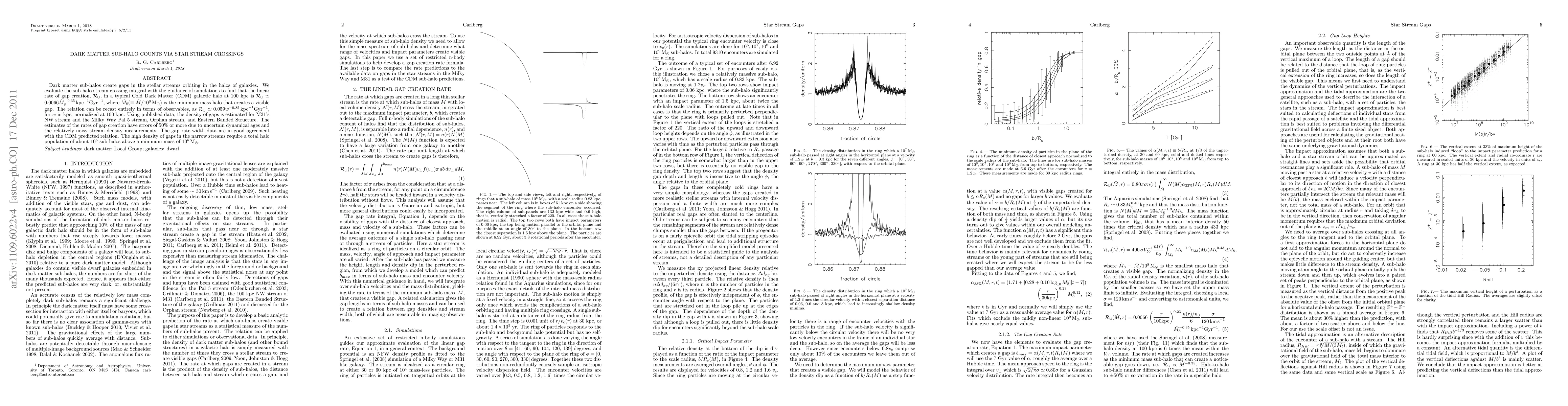 Dark matter sub-halos create gaps in the stellar streams orbiting in the halos of galaxies. We evaluate the sub-halo stream crossing integral with the guidance of simulations to find that the linear rate of gap creation, R_gap, in a typical Cold Dark Matter (CDM) galactic halo at 100 kpc is R_gap = 0.0066 M_8^-0.35 kpc^-1 Gyr^-1$, where M_8 = M/10^8 M_sun, is the minimum mass halo that creates a visible gap. The relation can be recast entirely in terms of observables, as R_gap= 0.059 w^-0.85 kpc^-1 Gyr^-1, for w in kpc, normalized at 100 kpc. Using published data, the density of gaps is estimated for M31's NW stream and the Milky Way Pal 5 stream, Orphan stream, and Eastern Banded Structure. The estimated rates of gap creation all have errors of 50% or more due to uncertain dynamical ages and the relatively noisy stream density measurements. The gap rate-width data are in good agreement with the CDM predicted relation. The high density of gaps in the narrow streams require a total halo population of 10^5 sub-halos above a minimum mass of 10^5 M_sun.