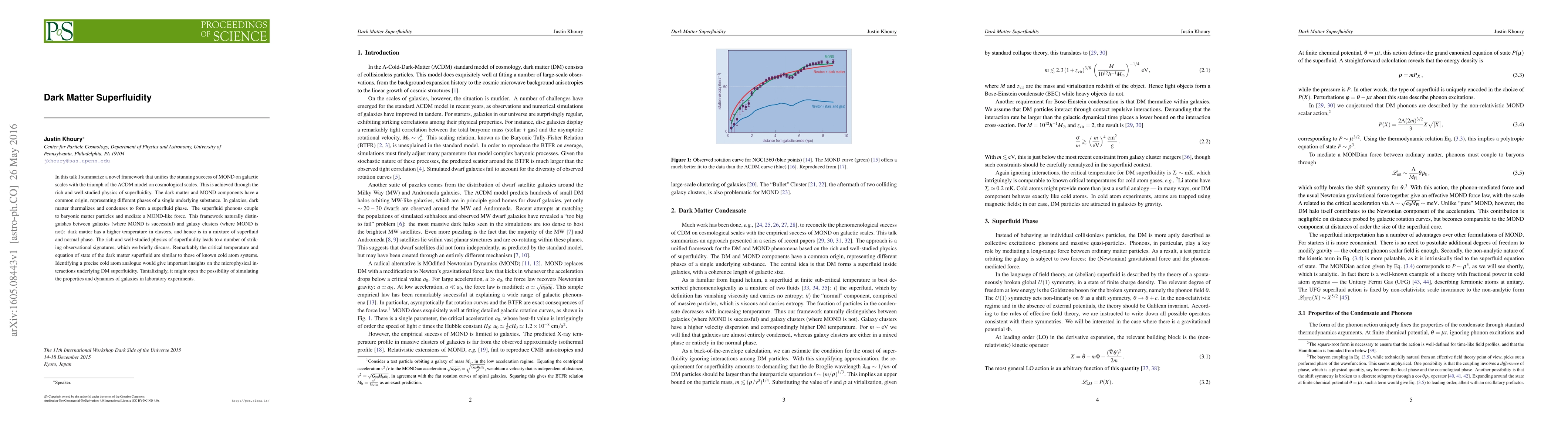 In this talk I summarize a novel framework that unifies the stunning success of MOND on galactic scales with the triumph of the $\Lambda$CDM model on cosmological scales. This is achieved through the rich and well-studied physics of superfluidity. The dark matter and MOND components have a common origin, representing different phases of a single underlying substance. In galaxies, dark matter thermalizes and condenses to form a superfluid phase. The superfluid phonons couple to baryonic matter particles and mediate a MOND-like force. This framework naturally distinguishes between galaxies (where MOND is successful) and galaxy clusters (where MOND is not): dark matter has a higher temperature in clusters, and hence is in a mixture of superfluid and normal phase. The rich and well-studied physics of superfluidity leads to a number of striking observational signatures, which we briefly discuss. Remarkably the critical temperature and equation of state of the dark matter superfluid are similar to those of known cold atom systems. Identifying a precise cold atom analogue would give important insights on the microphysical interactions underlying DM superfluidity. Tantalizingly, it might open the possibility of simulating the properties and dynamics of galaxies in laboratory experiments.