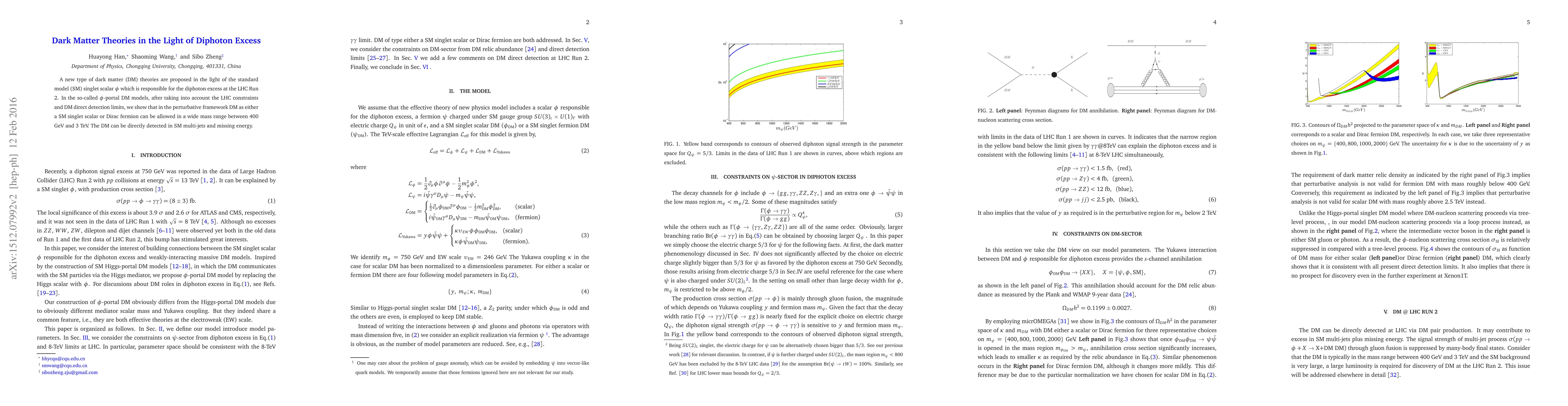 This paper proposes new dark matter theories involving a standard model singlet scalar $\phi$ to explain the diphoton excess observed at the LHC. It demonstrates that within $\phi$-portal dark matter models, dark matter as either a singlet scalar or Dirac fermion can exist in a mass range of 400 GeV to 3 TeV, subject to LHC constraints and direct detection limits.