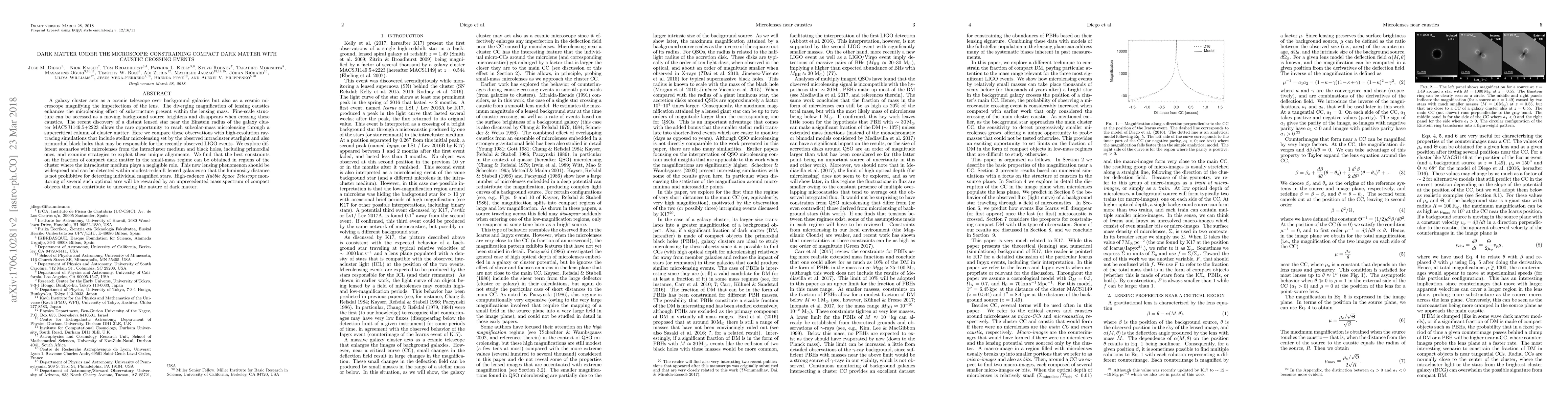This research explores the use of galaxy clusters as 'cosmic microscopes' to study dark matter, focusing on caustic crossing events. By comparing observations near MACSJ1149.5+2223 with simulations, the study finds that intracluster medium and primordial black holes can be distinguished, offering new strategies to detect and analyze compact dark matter objects, potentially unveiling their nature.