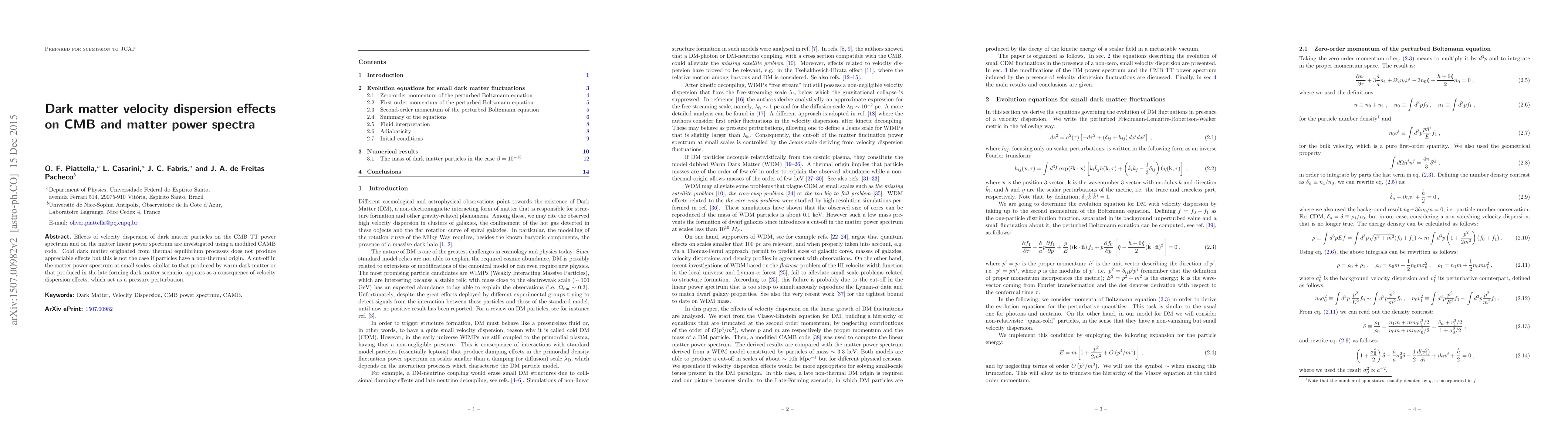This paper investigates how dark matter velocity dispersion influences the CMB TT power spectrum and the matter linear power spectrum using a modified CAMB code. While cold dark matter from thermal equilibrium has negligible effects, non-thermal dark matter particles lead to a cut-off in the matter power spectrum at small scales, akin to warm dark matter or late-forming dark matter scenarios, due to pressure perturbations from velocity dispersion.