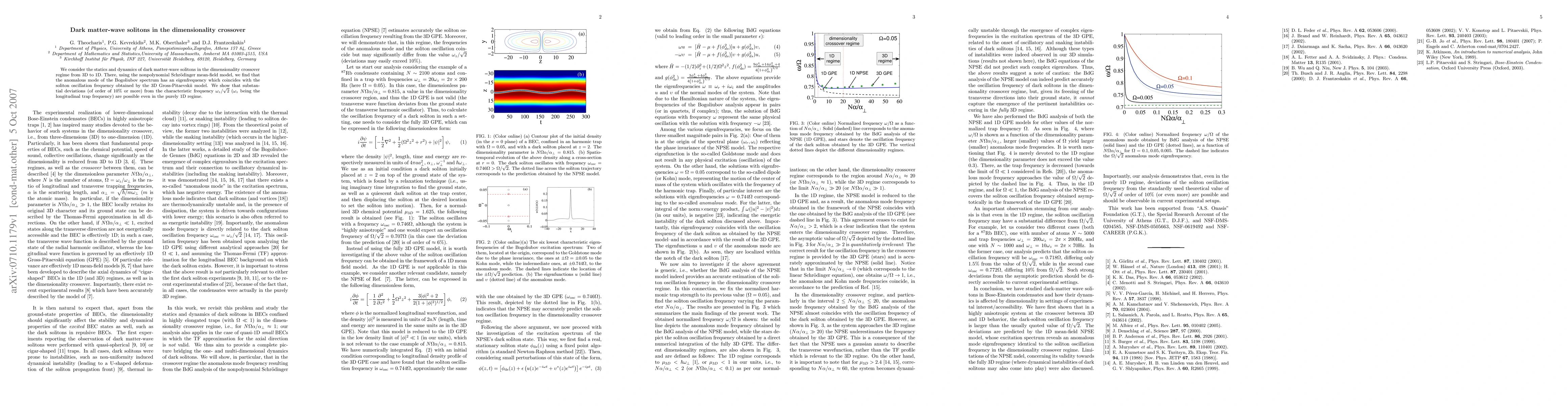 We consider the statics and dynamics of dark matter-wave solitons in the dimensionality crossover regime from 3D to 1D. There, using the nonpolynomial Schr\"{o}dinger mean-field model, we find that the anomalous mode of the Bogoliubov spectrum has an eigenfrequency which coincides with the soliton oscillation frequency obtained by the 3D Gross-Pitaevskii model. We show that substantial deviations (of order of 10% or more) from the characteristic frequency $\omega_{z}/\sqrt{2}$ ($\omega_{z}$ being the longitudinal trap frequency) are possible even in the purely 1D regime.