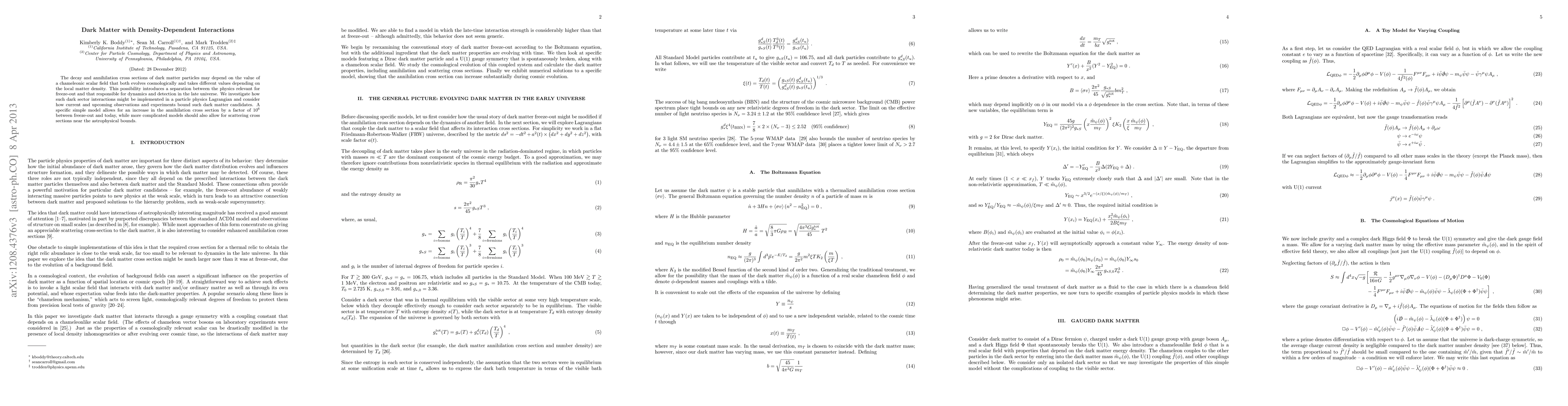 The decay and annihilation cross sections of dark matter particles may depend on the value of a chameleonic scalar field that both evolves cosmologically and takes different values depending on the local matter density. This possibility introduces a separation between the physics relevant for freeze-out and that responsible for dynamics and detection in the late universe. We investigate how such dark sector interactions might be implemented in a particle physics Lagrangian and consider how current and upcoming observations and experiments bound such dark matter candidates. A specific simple model allows for an increase in the annihilation cross section by a factor of $10^6$ between freeze-out and today, while more complicated models should also allow for scattering cross sections near the astrophysical bounds.
