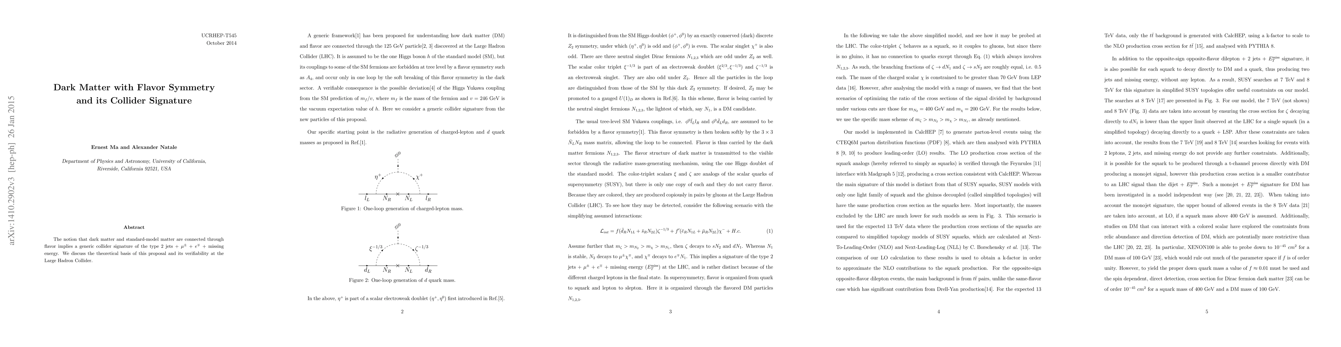 Researchers propose a potential collider signature for dark matter with flavor symmetry: 2 jets + $μ^ extrm{+}$ + $e^ extrm{-}$ + missing energy. They discuss its theoretical basis and verifiability at the Large Hadron Collider.