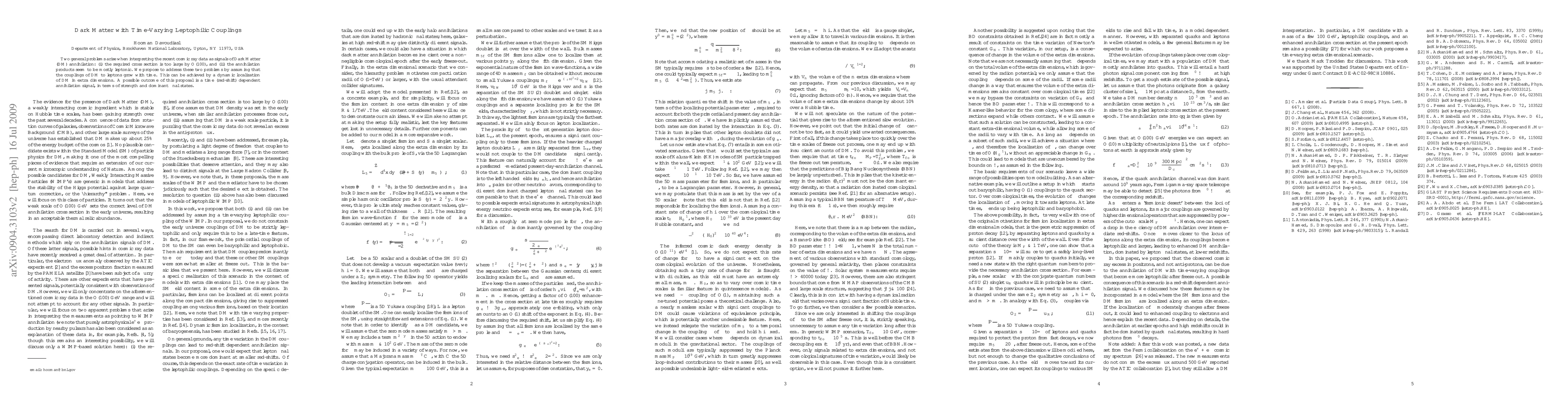 Two general problems arise when interpreting the recent cosmic ray data as signals of Dark Matter (DM) annihilation: (i) the required cross section is too large by O(100), and (ii) the annihilation products seem to be mostly leptonic. We propose to address these two problems by assuming that the couplings of DM to leptons grow with time. This can be achieved by a dynamic localization of DM in extra dimensions. A possible outcome of this proposal is a time (red-shift) dependent annihilation signal, in terms of strength and dominant final states.