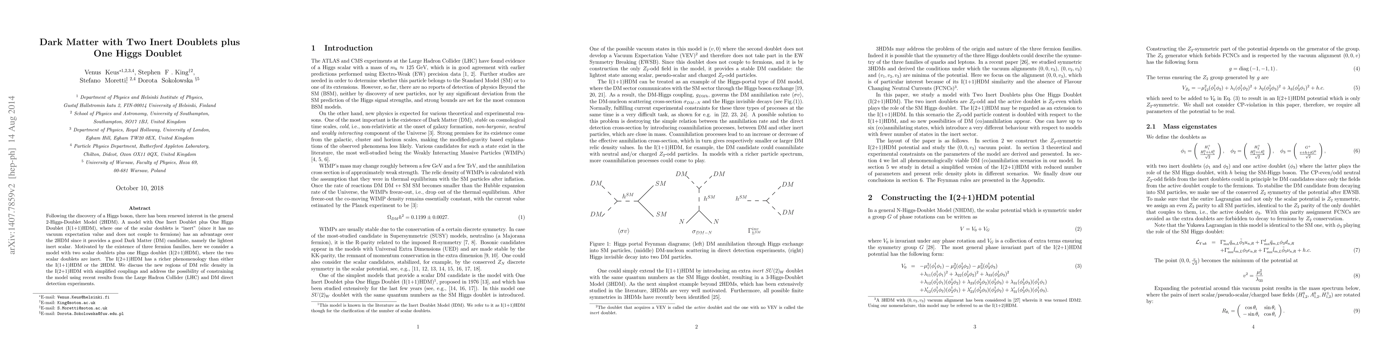 This paper explores a 2-Higgs-Doublet Model (2HDM) with two inert doublets and one Higgs doublet, termed I(2+1)HDM. It investigates the model's richer phenomenology and potential for providing a viable Dark Matter candidate, analyzing new regions of DM relic density and discussing constraints from LHC and direct detection experiments.