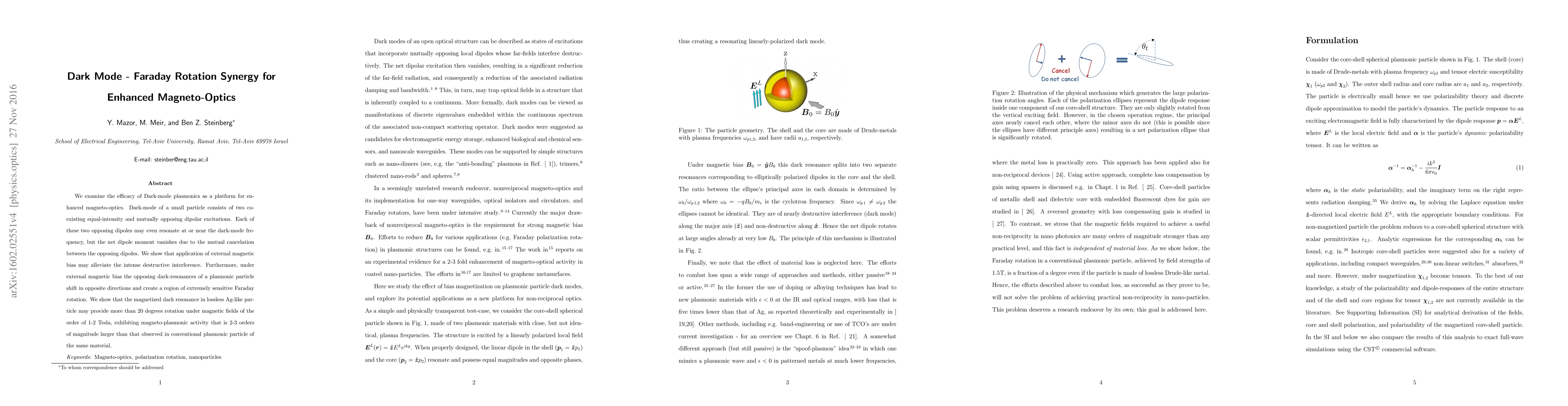 We examine the efficacy of Dark-mode plasmonics as a platform for enhanced magneto-optics. Dark-mode of a small particle consists of two co-existing equal-intensity and mutually opposing dipolar excitations. Each of these two opposing dipoles may even resonate at or near the dark-mode frequency, but the net dipole moment vanishes due to the mutual cancelation between the opposing dipoles. We show that application of external magnetic bias may alleviate the intense destructive interference. Furthermore, under external magnetic bias the opposing dark-resonances of a plasmonic particle shift in opposite directions and create a region of extremely sensitive Faraday rotation. We show that the magnetized dark resonance in lossless Ag-like particle may provide more than 20 degrees rotation under magnetic fields of the order of 1-2 Tesla, exhibiting magneto-plasmonic activity that is 2-3 orders of magnitude larger than that observed in conventional plasmonic particle of the same material.