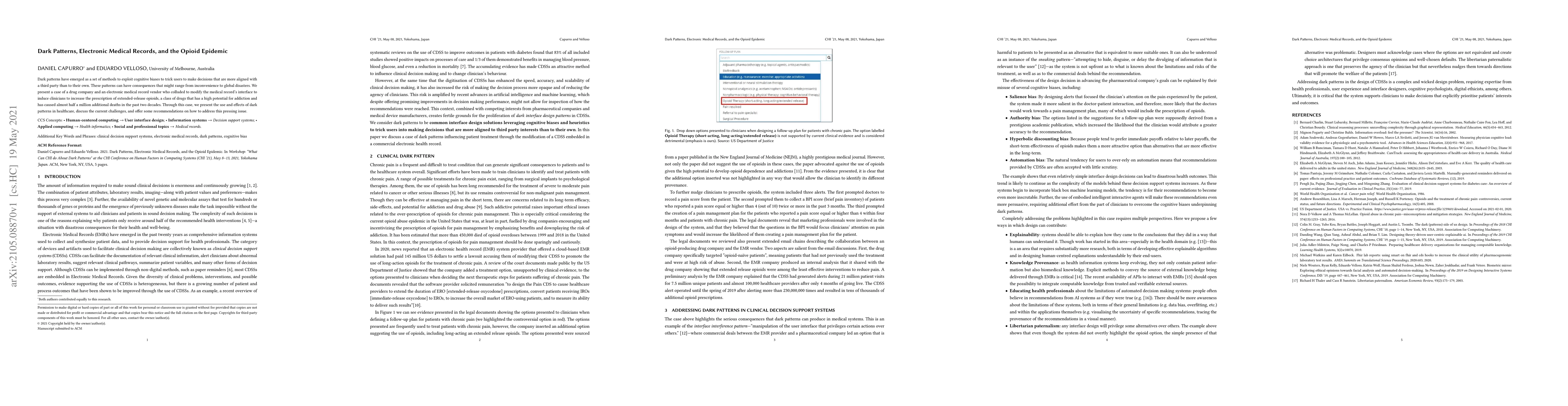 Dark patterns have emerged as a set of methods to exploit cognitive biases to trick users to make decisions that are more aligned with a third party than to their own. These patterns can have consequences that might range from inconvenience to global disasters. We present a case of a drug company and an electronic medical record vendor who colluded to modify the medical record's interface to induce clinicians to increase the prescription of extended-release opioids, a class of drugs that has a high potential for addiction and has caused almost half a million additional deaths in the past two decades. Through this case, we present the use and effects of dark patterns in healthcare, discuss the current challenges, and offer some recommendations on how to address this pressing issue.