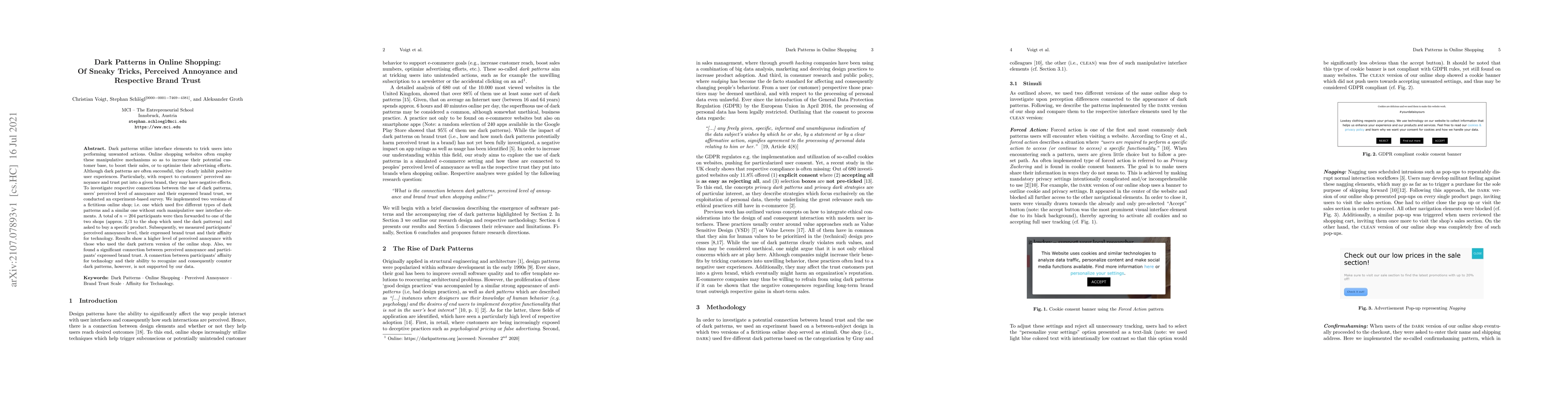 Online shopping websites often use dark patterns to trick users into performing unwanted actions, leading to increased annoyance and decreased brand trust, according to an experiment-based survey of 204 participants.