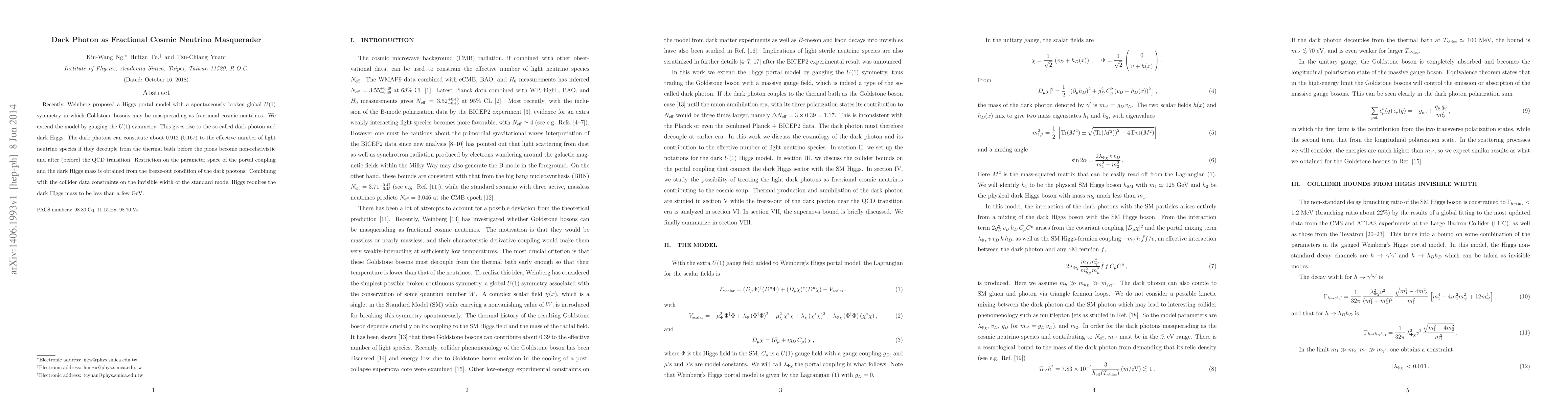 Recently, Weinberg proposed a Higgs portal model with a spontaneously broken global $U(1)$ symmetry in which Goldstone bosons may be masquerading as fractional cosmic neutrinos. We extend the model by gauging the $U(1)$ symmetry. This gives rise to the so-called dark photon and dark Higgs. The dark photons can constitute about 0.912 (0.167) to the effective number of light neutrino species if they decouple from the thermal bath before the pions become non-relativistic and after (before) the QCD transition. Restriction on the parameter space of the portal coupling and the dark Higgs mass is obtained from the freeze-out condition of the dark photons. Combining with the collider data constraints on the invisible width of the standard model Higgs requires the dark Higgs mass to be less than a few GeV.