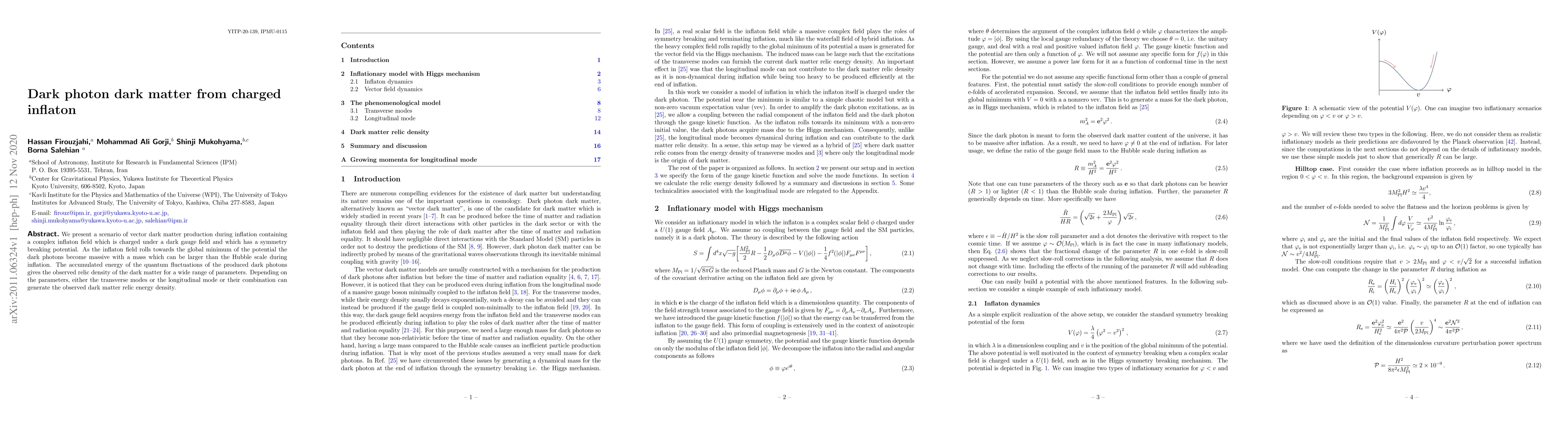 This paper explores a model where dark photon dark matter is produced during inflation through a charged inflaton field interacting with a dark gauge field. The dark photons acquire mass during inflation, and their quantum fluctuations contribute to the observed dark matter relic density. The study finds that either transverse or longitudinal modes of the dark photons can account for this density depending on the model parameters.