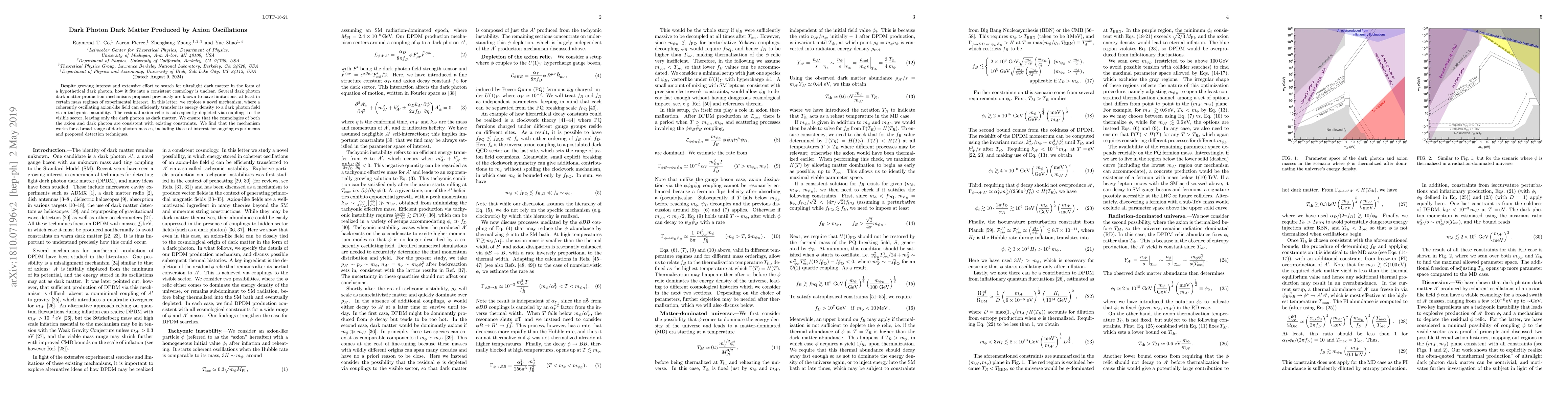 This paper proposes a novel mechanism for producing dark photon dark matter through axion oscillations, where a coherently oscillating axion field transfers its energy to a dark photon field via a tachyonic instability. The resulting dark photon serves as dark matter, consistent with existing cosmological constraints.