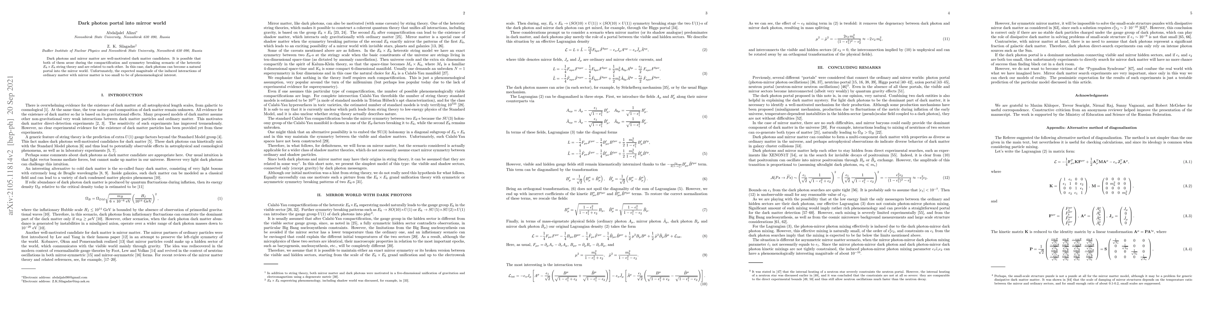 Dark photons and mirror matter are well-motivated dark matter candidates. It is possible that both of them arose during the compactification and symmetry breaking scenario of the heterotic $E_8\times E_8$ string theory and are related to each other. In this case, dark photons can become a natural portal into the mirror world. Unfortunately, the expected magnitude of the induced interactions of ordinary matter with mirror matter is too small to be of phenomenological interest.